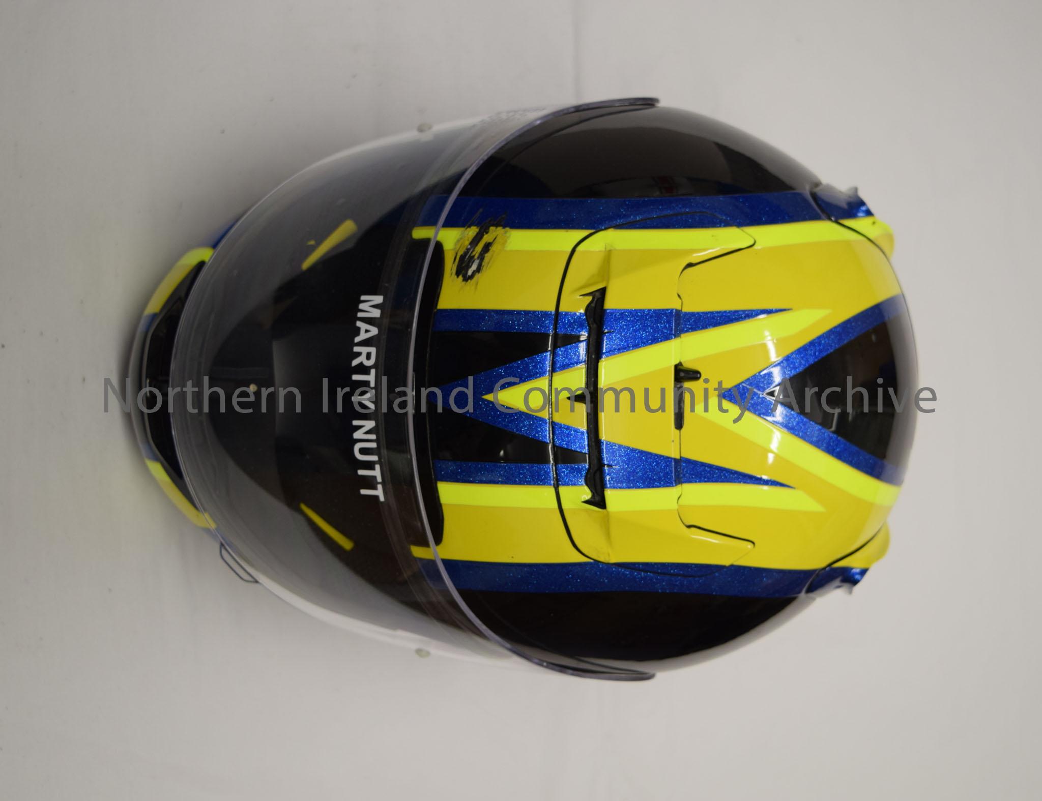 Shoei motorcycle helmet belonging to Marty Nutt. Black helmet with a yellow, fluorescent yellow and sparkly blue “M” pattern on the top.