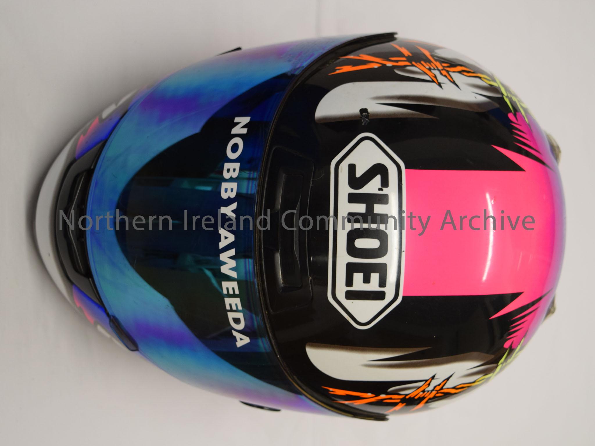 Shoei motorcycle helmet belonging to Nobby (Noboru) Ueda. Electric pink, purple, black and white patterns with Orange and bright yellow barbed wire an…