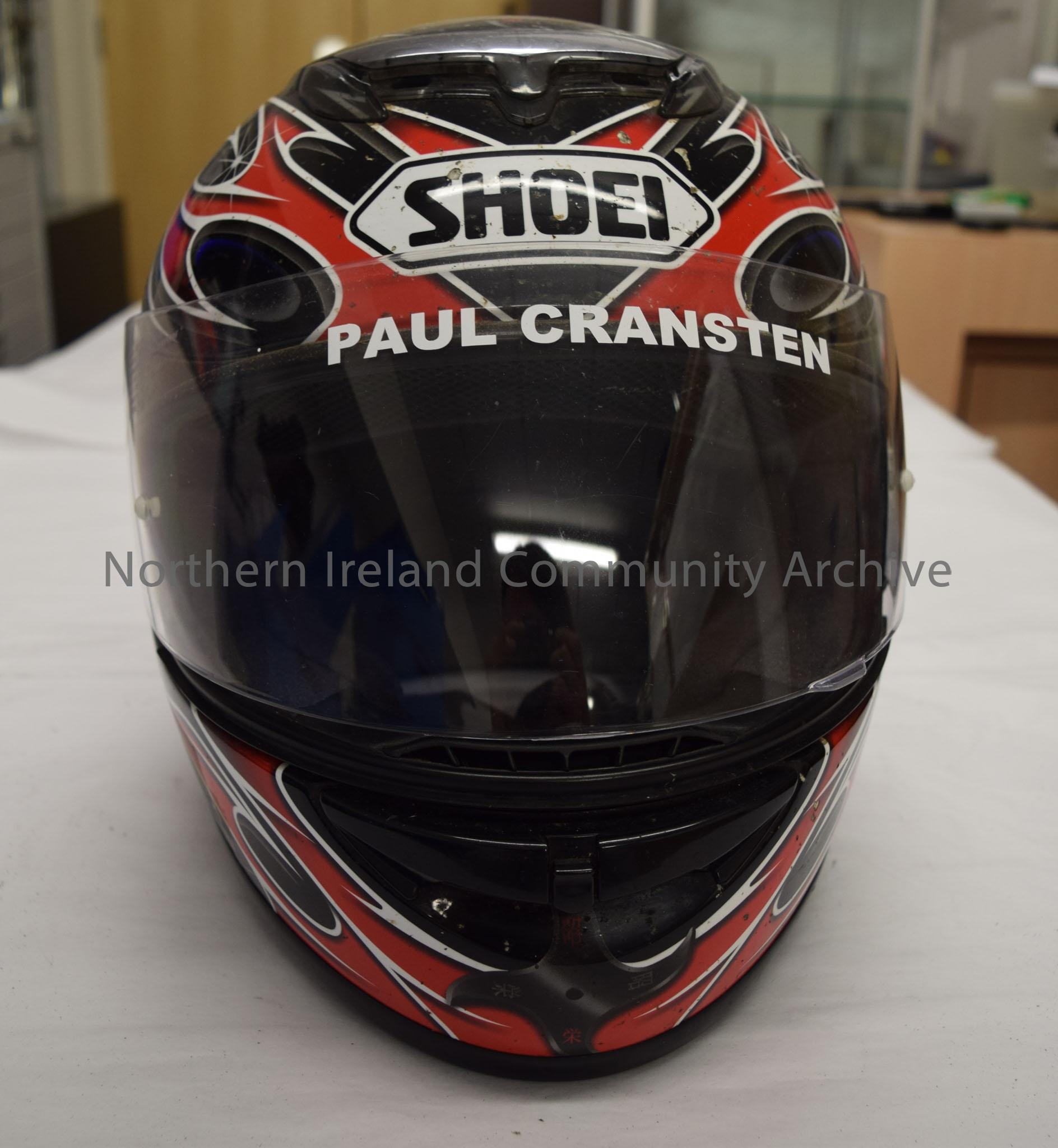 Shoei motorcycle helmet belonging to Paul Cranston. Black, red and dark blue patterned helmet with image of a red eye and part of a face on each side.