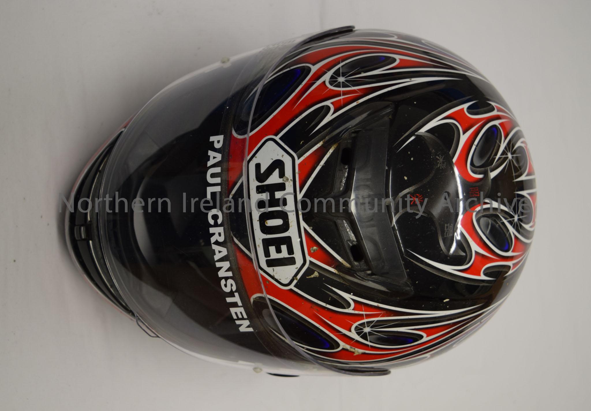 Shoei motorcycle helmet belonging to Paul Cranston. Black, red and dark blue patterned helmet with image of a red eye and part of a face on each side.