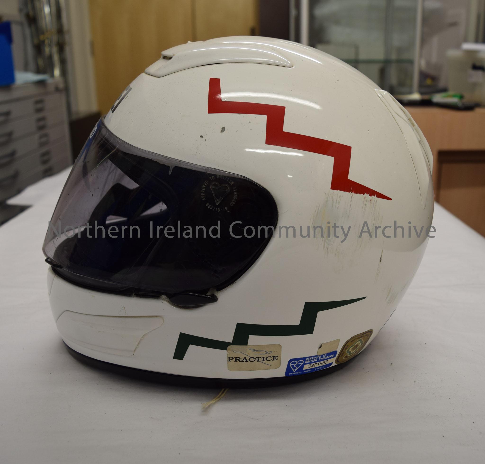 Shoei motorcycle helmet belonging to Philip Reid. White helmet with a red and green zigzag pattern down the sides.
