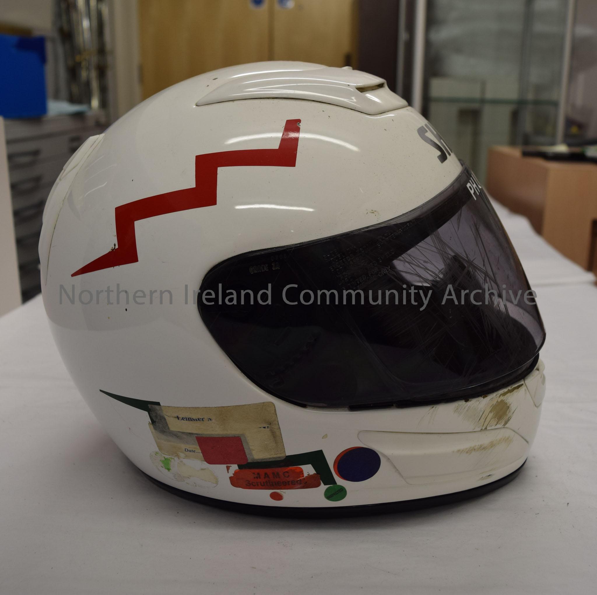 Shoei motorcycle helmet belonging to Philip Reid. White helmet with a red and green zigzag pattern down the sides.