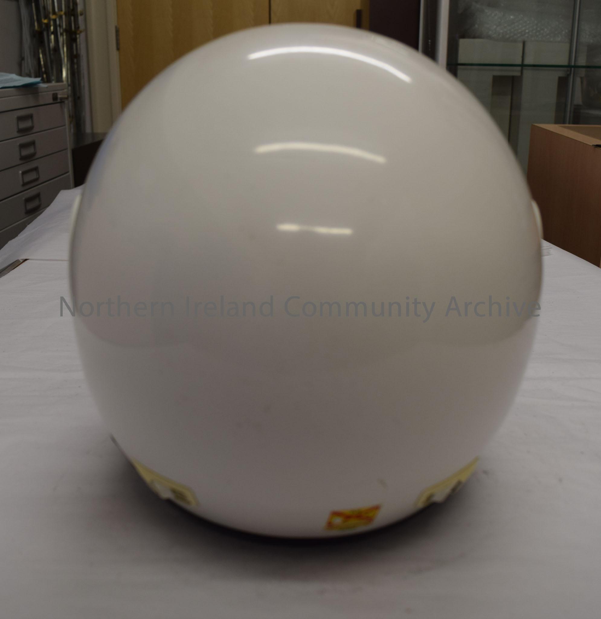 Shoei motorcycle helmet belonging to William Mulholland. Plain white with blue writing