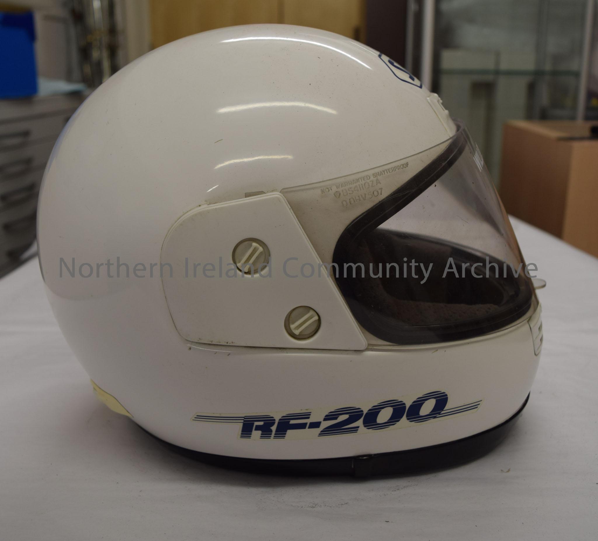 Shoei motorcycle helmet belonging to William Mulholland. Plain white with blue writing