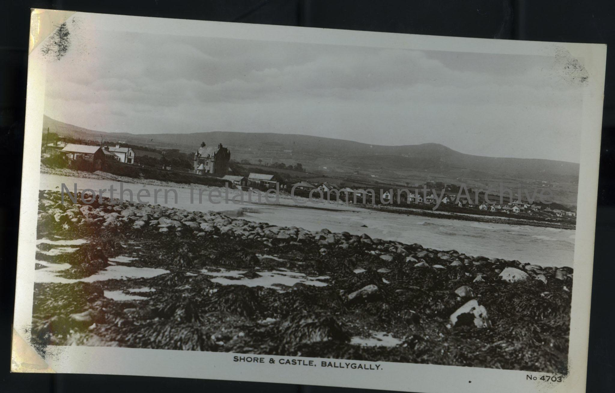 postcard depicting Shore and Castle, Ballygally. With houses in the distance withmountains, beach and seaweed