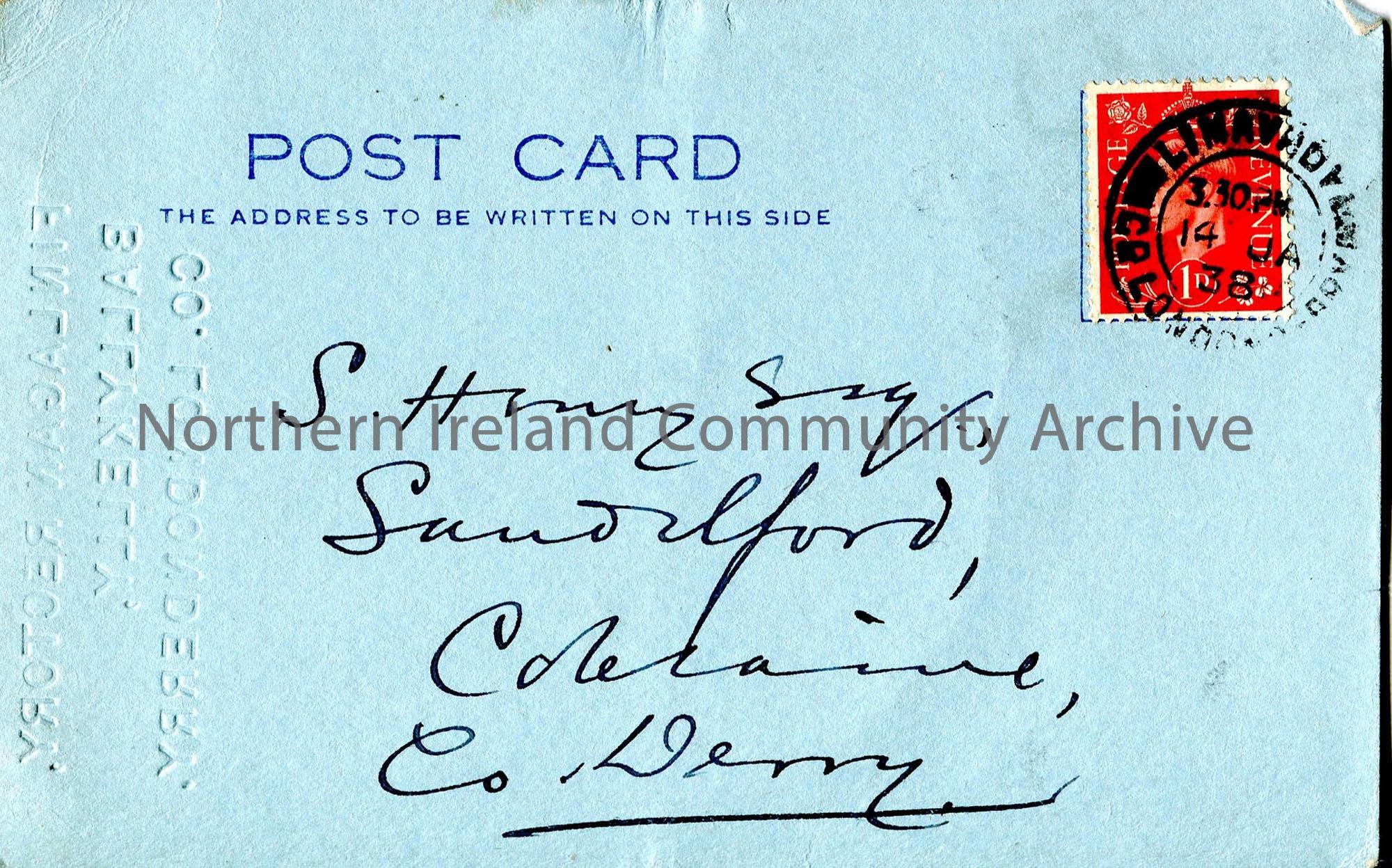 Short handwritten note on postcard – no t...