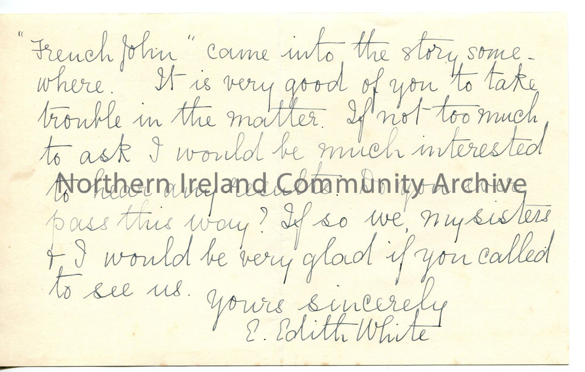 Short note accompanying 4 page script of information on McFetridge family – taken from aged mother who in turn learned it from her mother. A 1 1/2d po… – img720