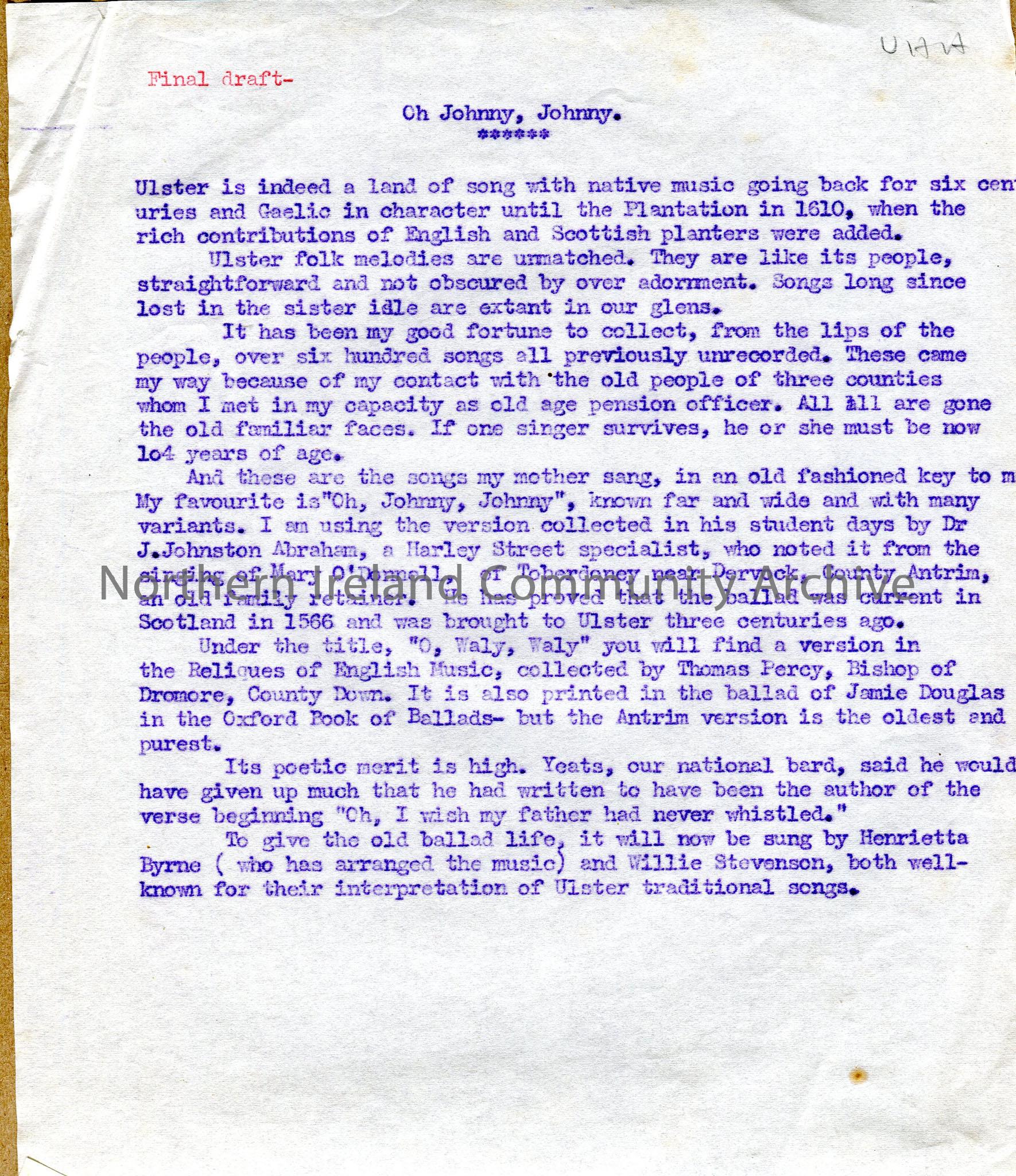 Short typed script - 'Oh Johnny, Johnny'. General short history of Ulster folk melodies, dealing with Scottish influence, general song origin. In relation to Oh Johnny Johnny, mentions J J Abraham, who got it from Mary O'Donnell, family retainer from Toberdoney near Dervock. Notes 'Final Draft'. UHH handwritten in pencil top right corner.