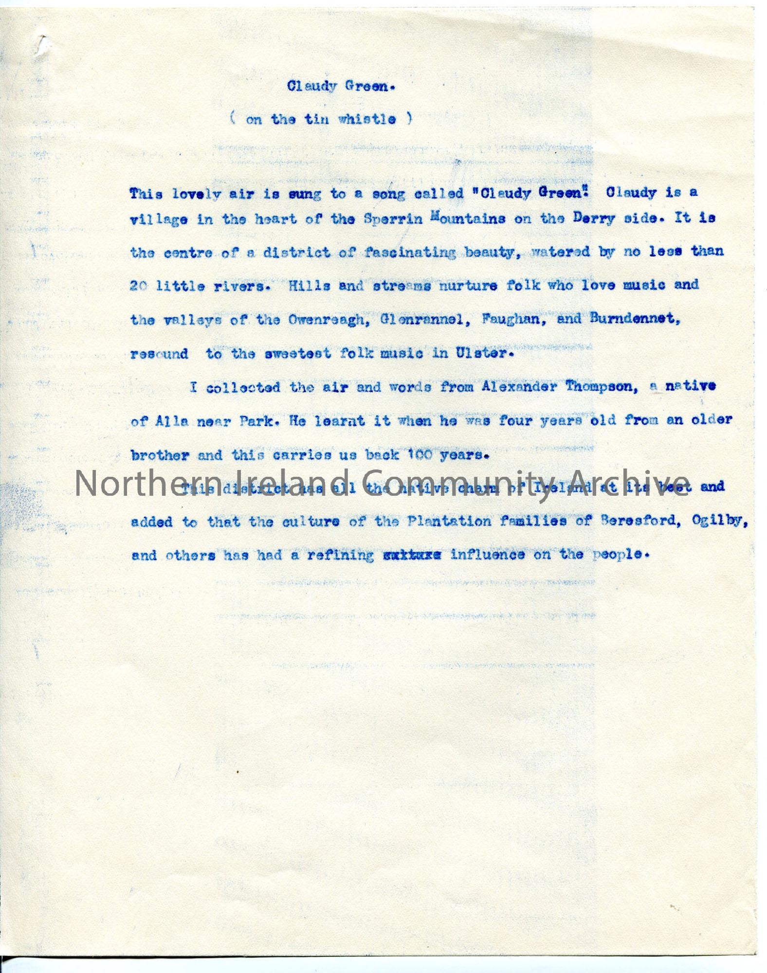 Short typed script under heading 'Claudy Green' - information on subject of song and area. Actual song not included
