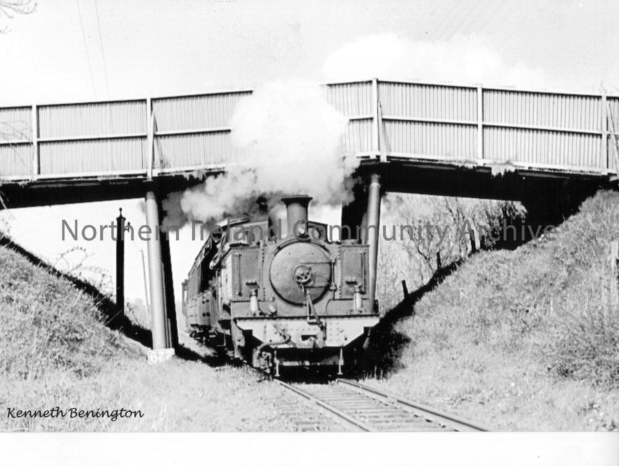 SI class 2-4-2T No.41 passes under the Conagher Bridge as it crosses the Garry Bog on its way from Ballycastle to Ballymoney with a passenger train