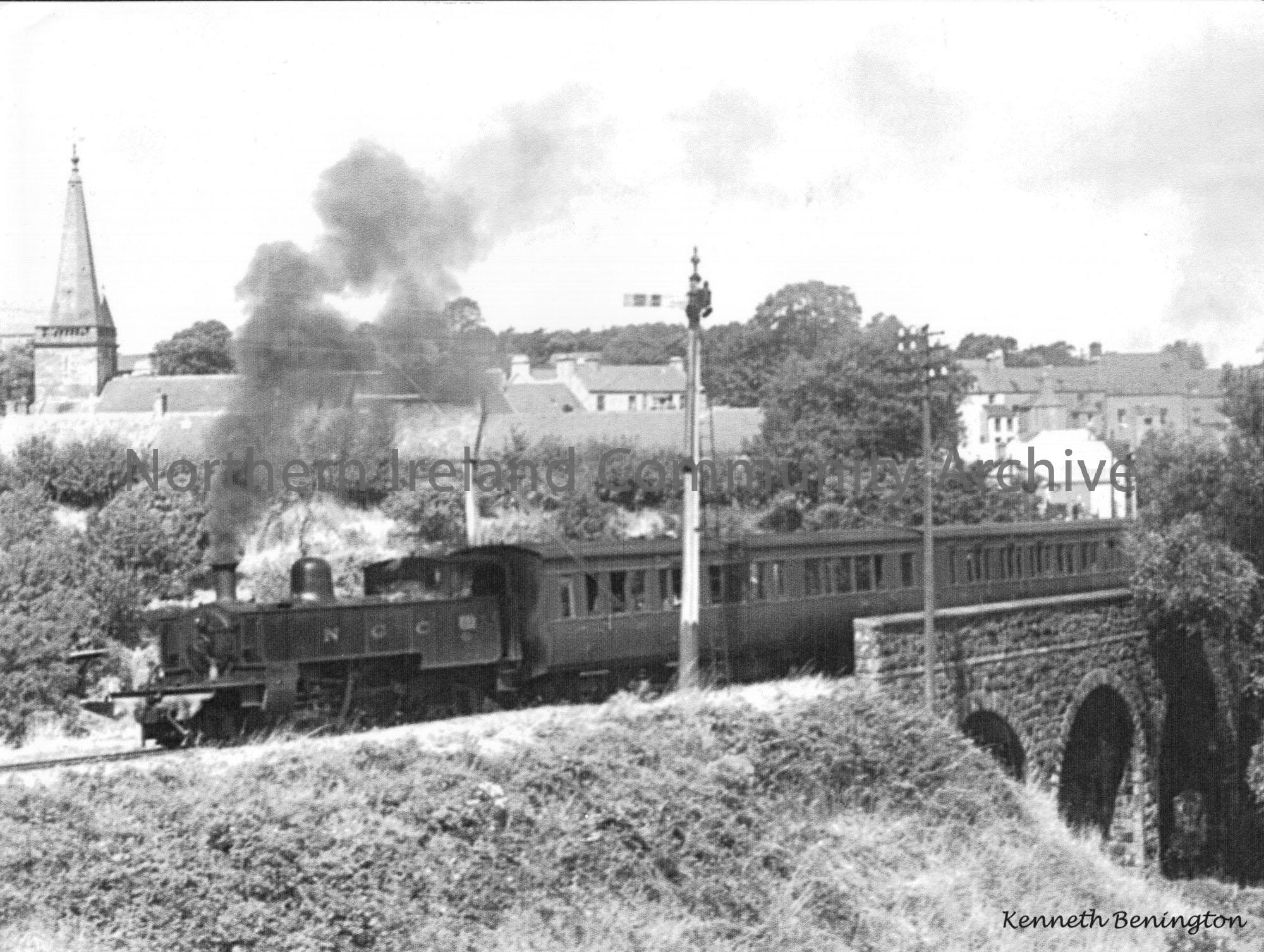 SI class 2-4-2T No.44, in NCC livery, crosses the Tow river shortly after leaving Ballycastle for Ballymoney.