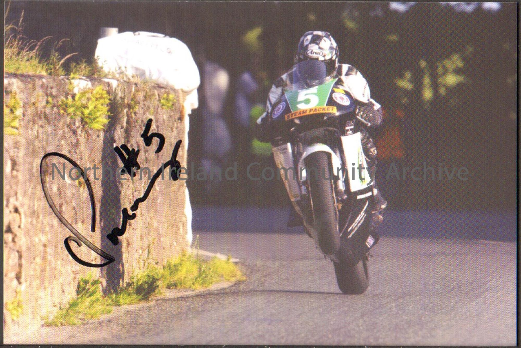 Signed photograph of Chris Palmer riding a black and white motorbike with number 5 on the front and black and white leathers doing a wheelie as he pas…