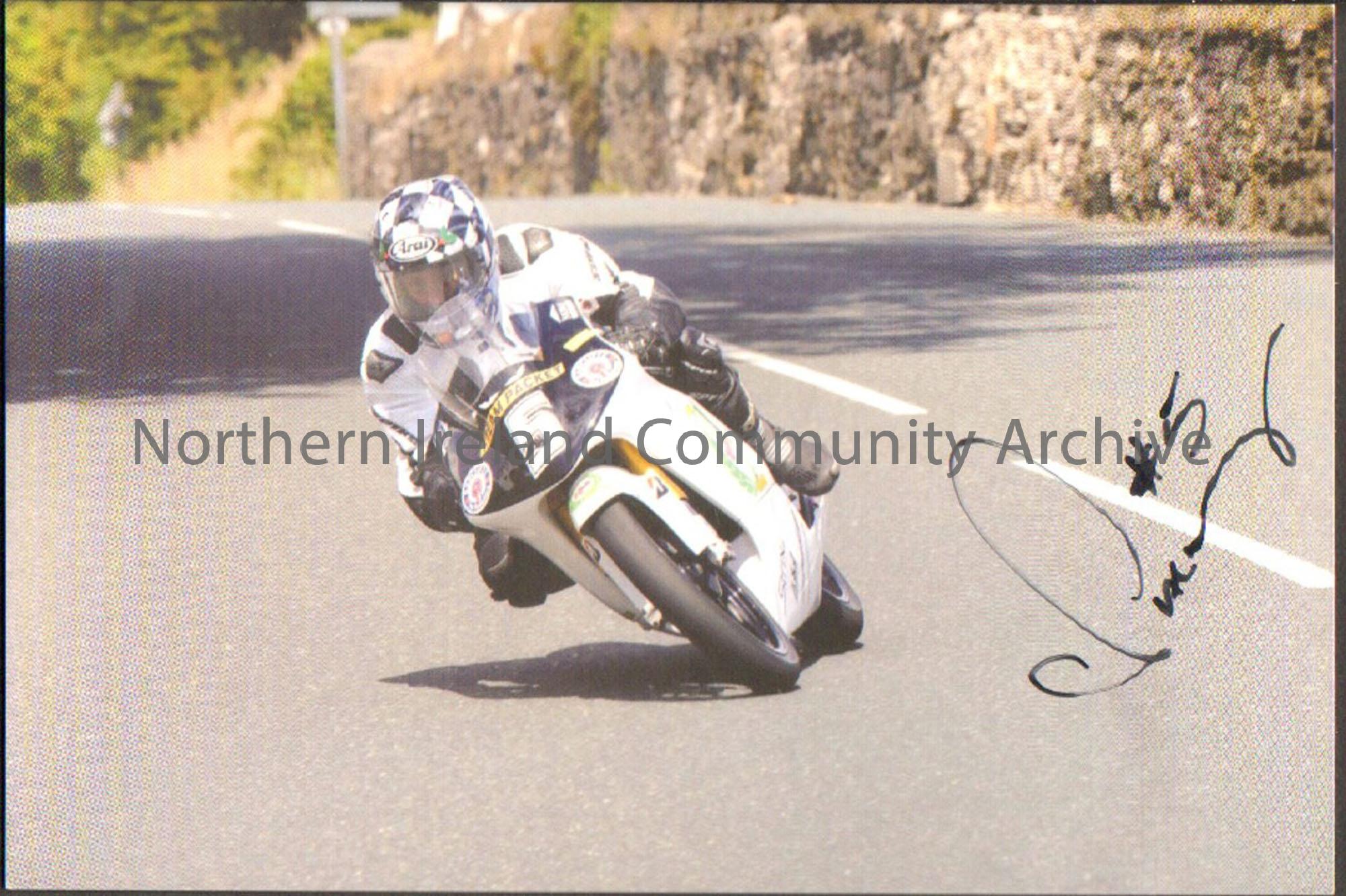 Signed photograph of Chris Palmer riding a black and white motorbike with number 5 on the front and wearing black and white leathers on a wide road wi…