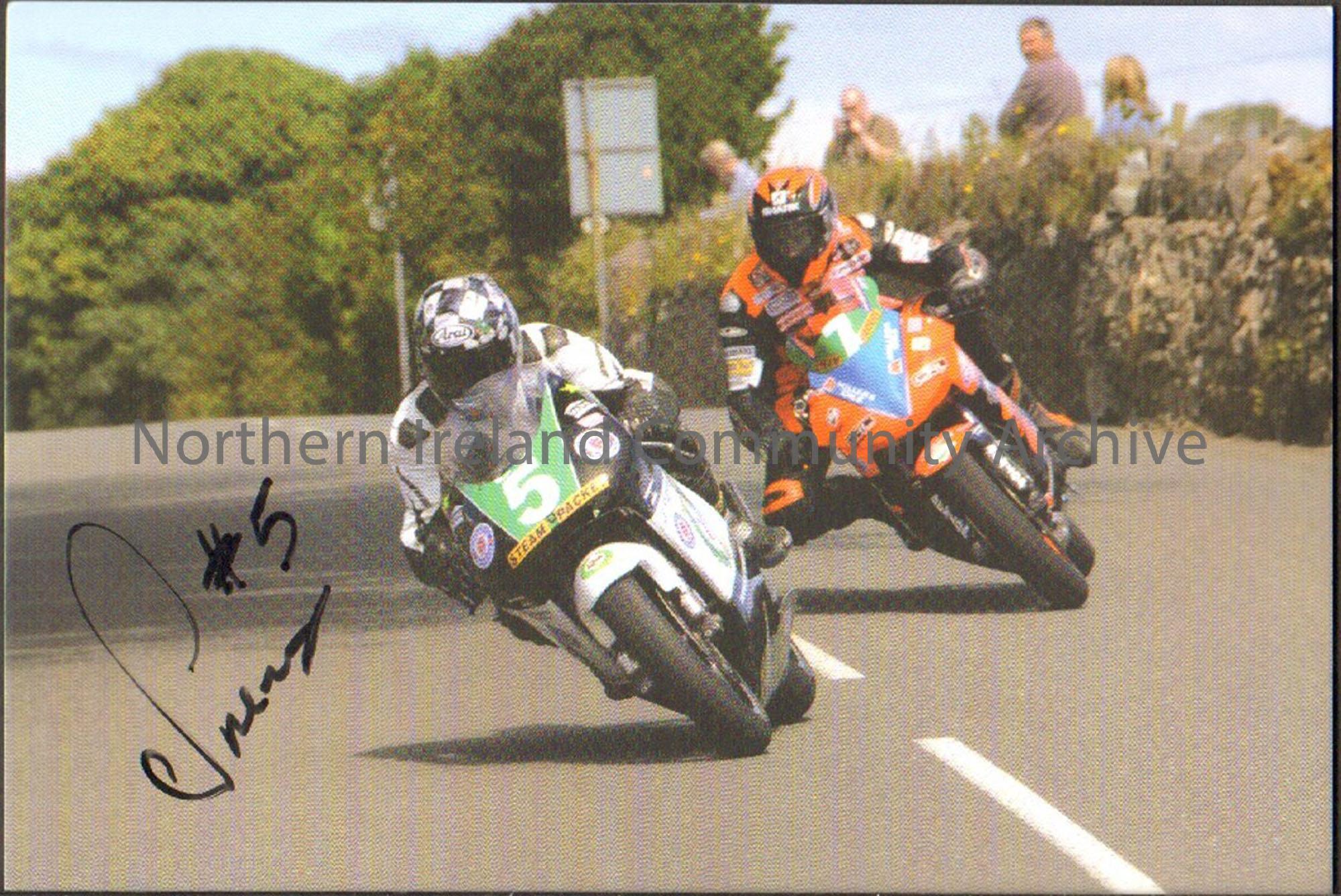 Signed photograph of Chris Palmer riding a black and white motorbike with number 5 on the front being followed by a rider on a red bike with a number 7 on the front.