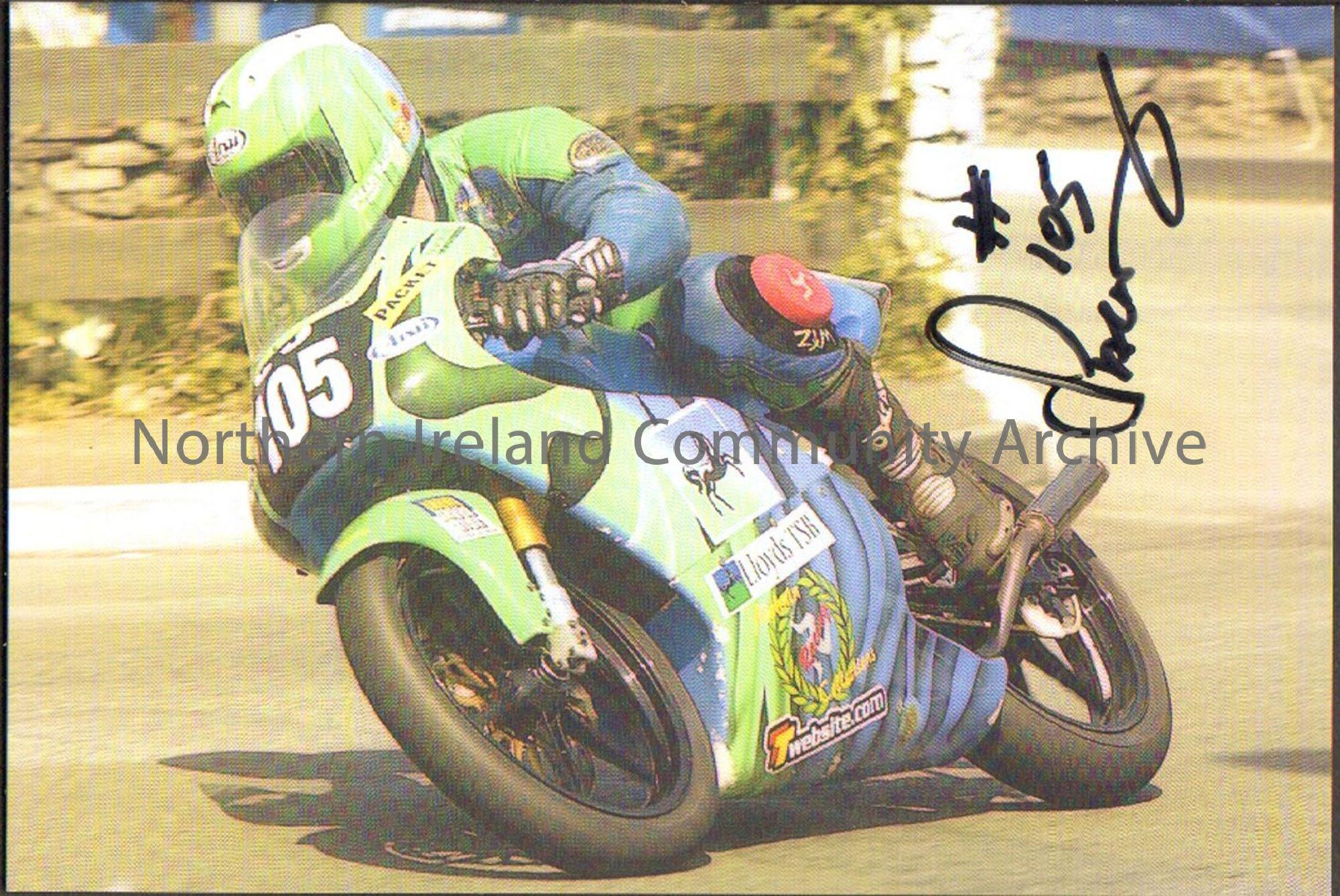 Signed photograph of Chris Palmer riding a blue and green motorbike with number 105 on the front and wearing blue and green leathers riding around a c…