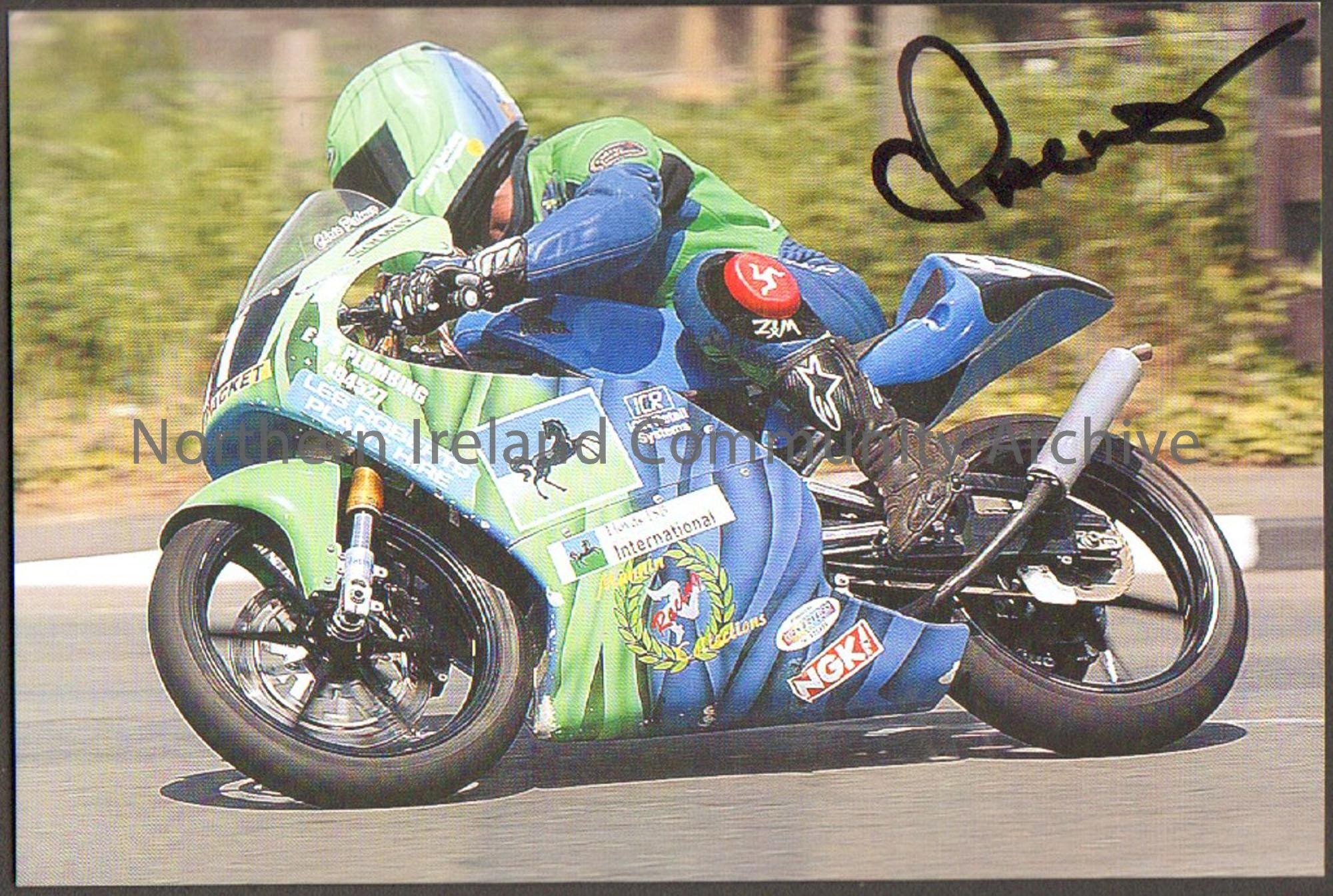 Signed photograph of Chris Palmer riding a green and blue motorbike wearing blue and green leathers in front of a hedge.