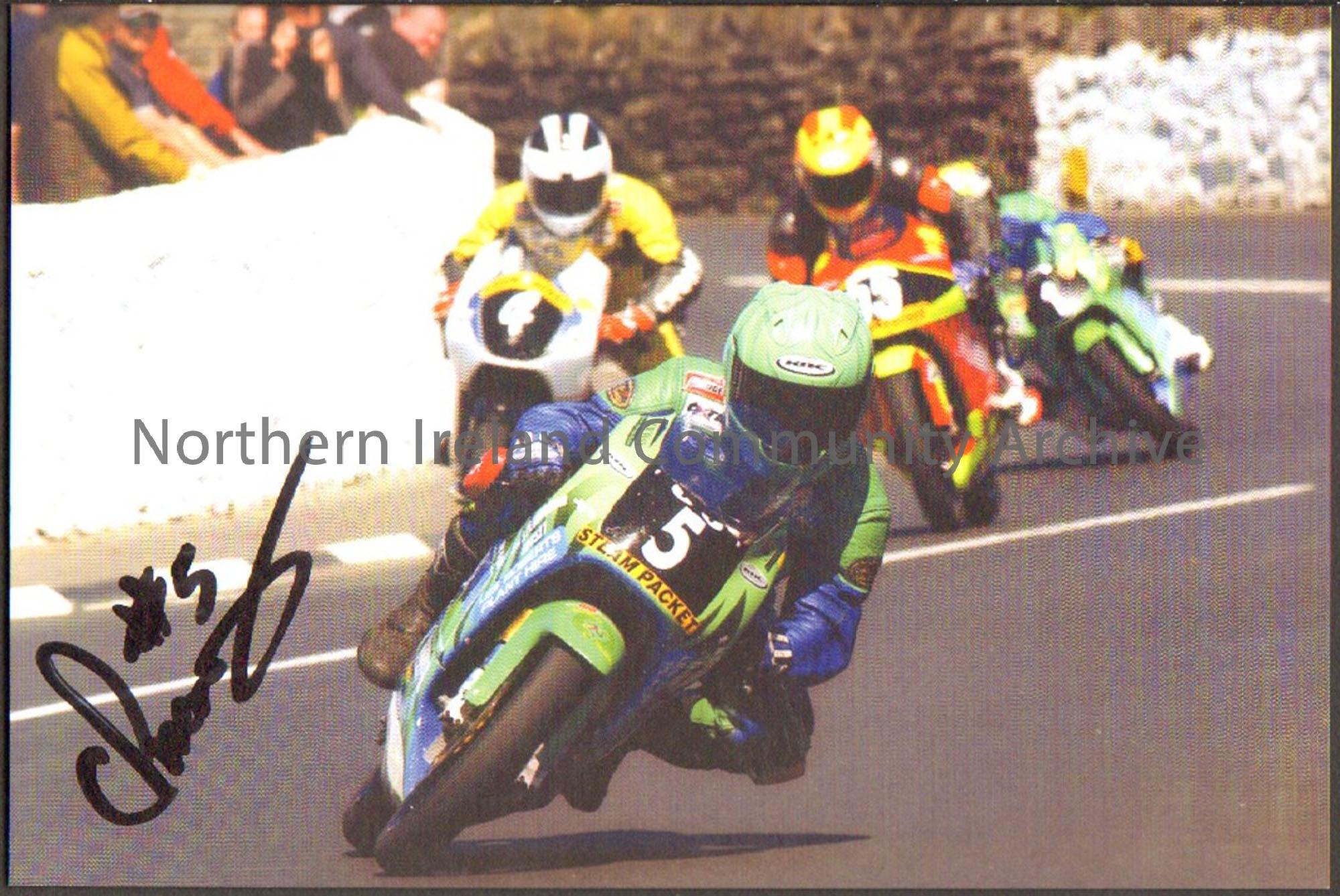 Signed photograph of Chris Palmer riding a green and blue motorbike with number 5 on the front leading Robert Dunlop on a motorbike with number 4 on the front, Darren Lindsay (number 15) and Ian Lougher (number 1) around a windy part of the road with a white wall in the background.