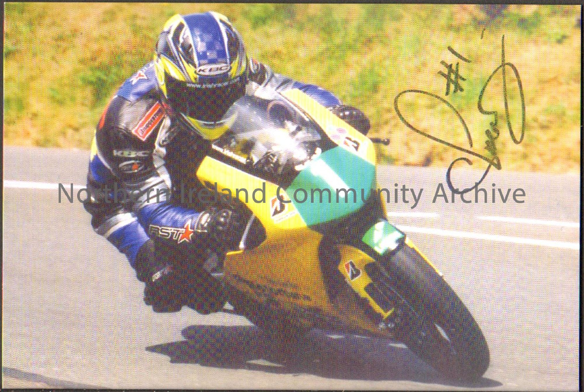 Signed photograph of Chris Palmer riding a green and yellow motorbike with number 1 on the front wearing black and blue leathers.