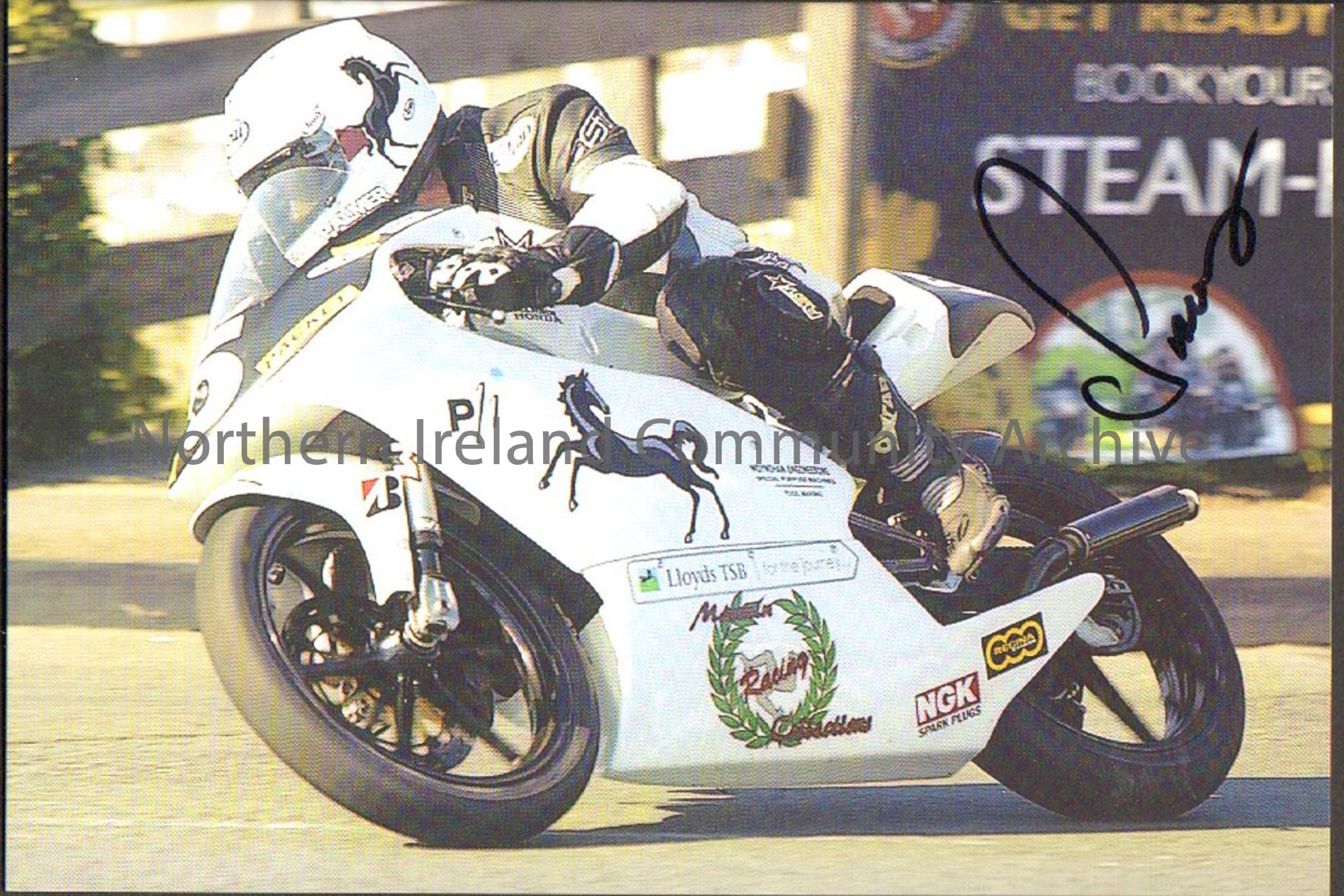 Signed photograph of Chris Palmer riding a white motorbike with number 5 on the front and a black horse on the side with a wooden fence in the backgro…