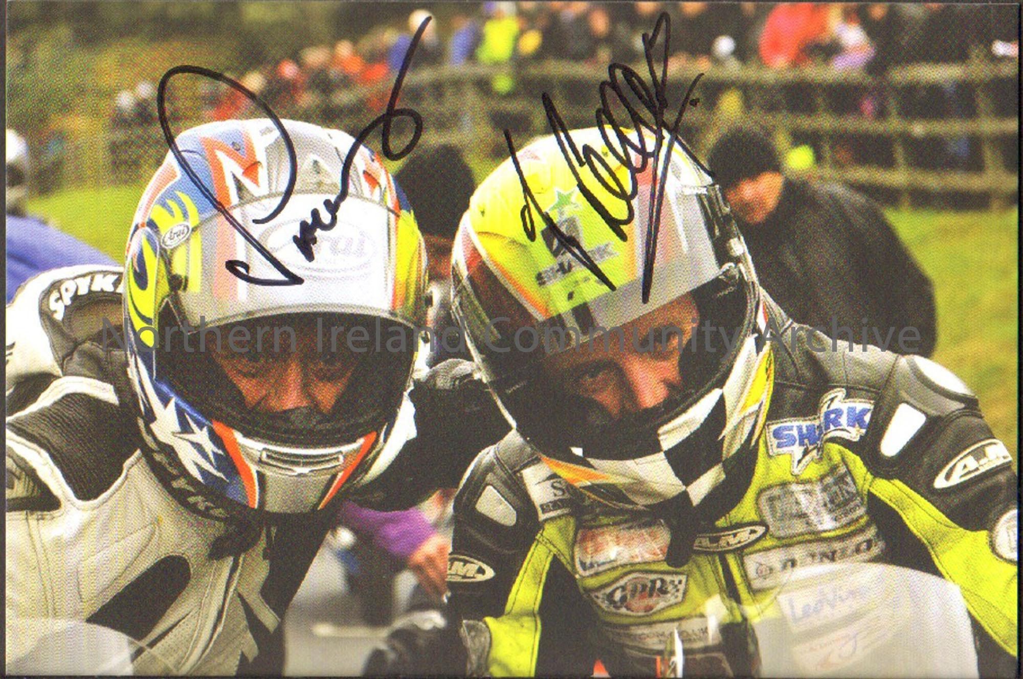 Signed photograph of Chris Palmer wearing white and black leathers with Ian Lougher wearing black and luminous green leathers. Both are wearing helmets