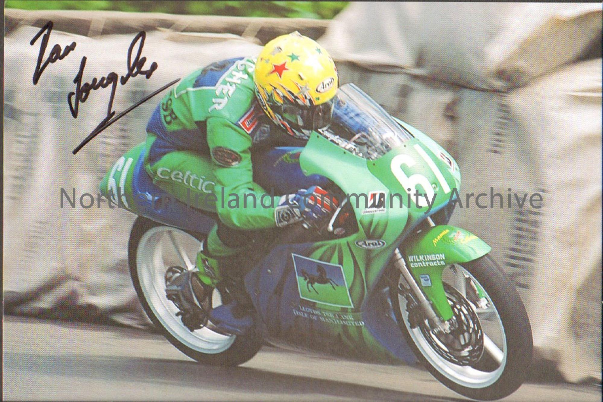 Signed photograph of Ian Lougher riding a green motorbike with number 61 on the front wearing green and blue leathers and a yellow Arai helmet with stars on it.
