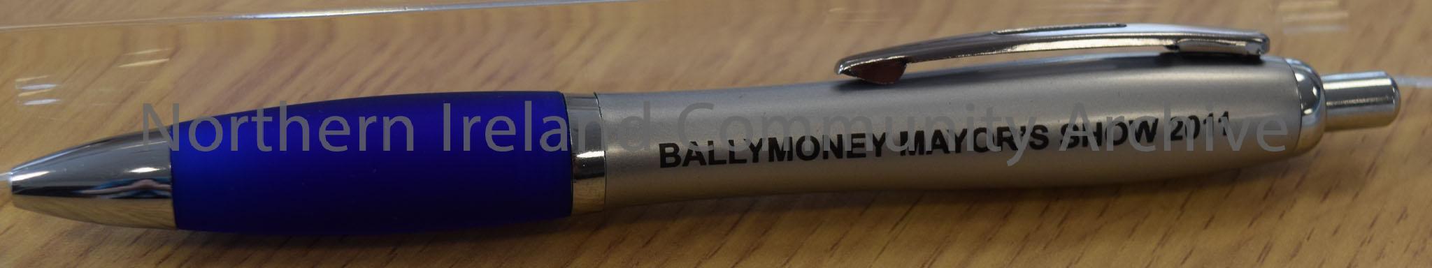 silver and blue pen with metal trimmings and clip. Inscribed on side is 'Ballymoney Mayor's Show 2011'. In plastic case.