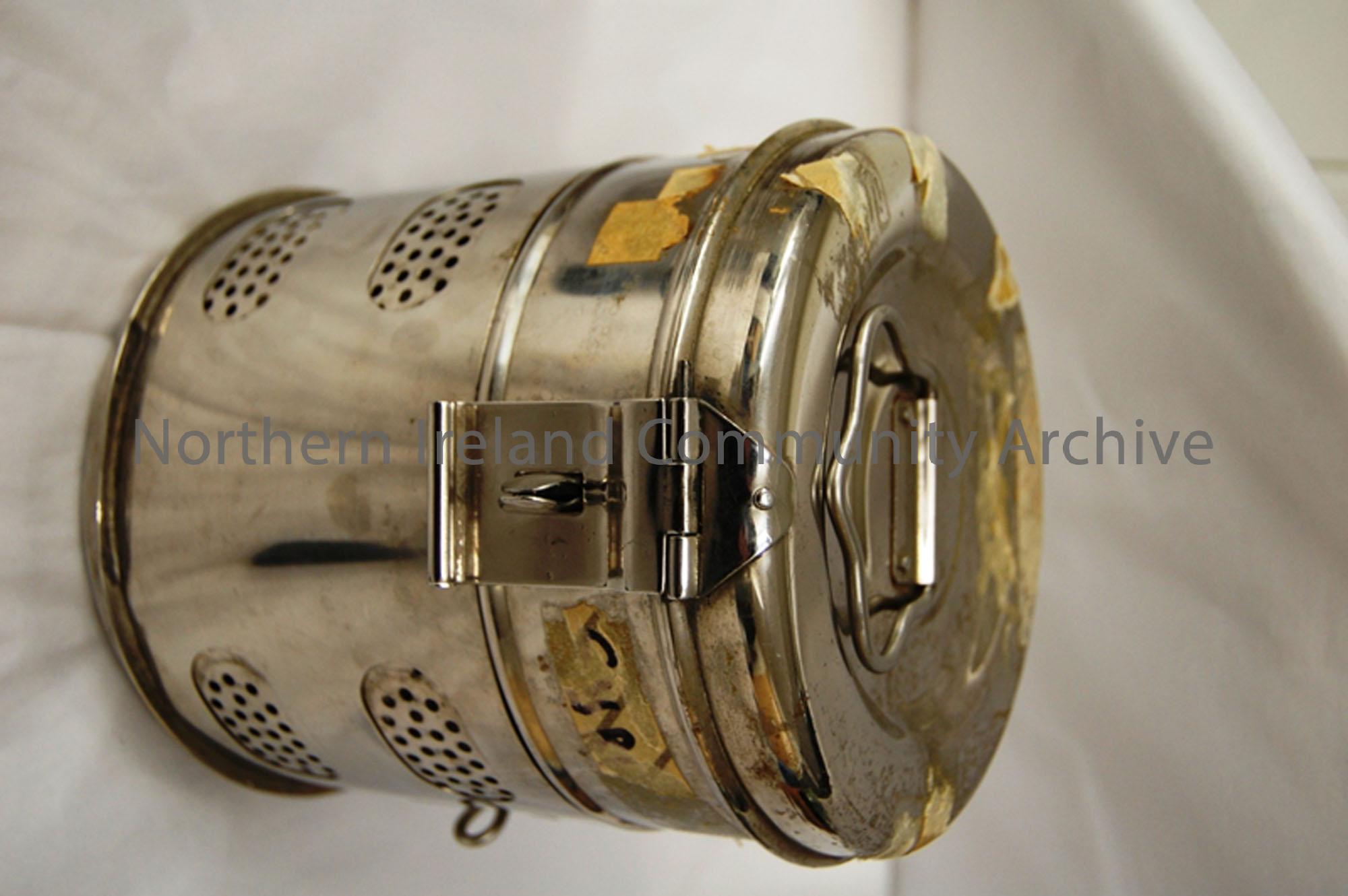 silver cylindrical object. used by health visitors to store utems such as vaccination equipment. it allows air to circulate
