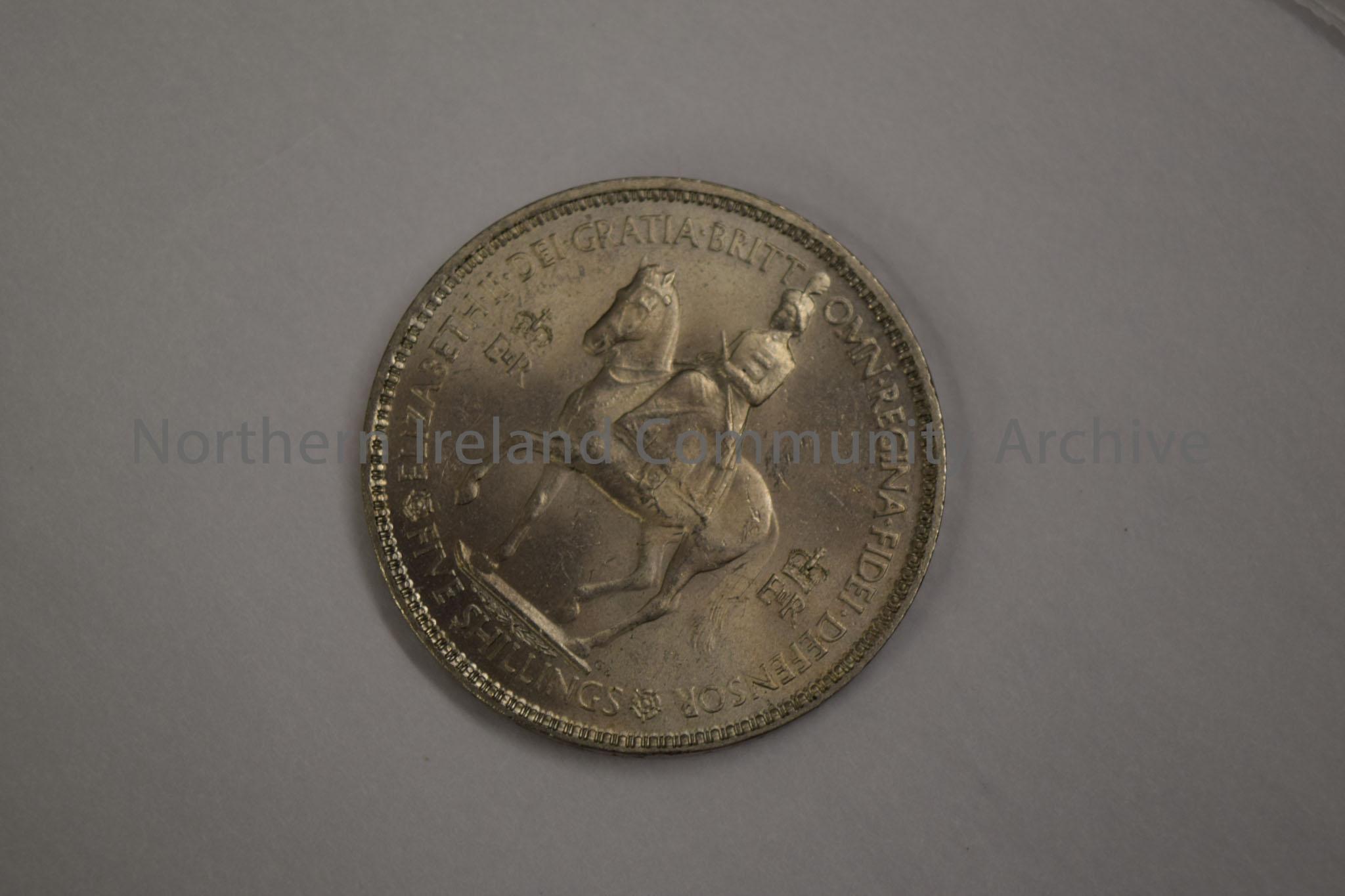 Silver five shillings coin for the 1953 Coronation in a clear plastic box with black inlay. Image of Elizabeth II on the front and four shields on the… – 2015.152 (2)