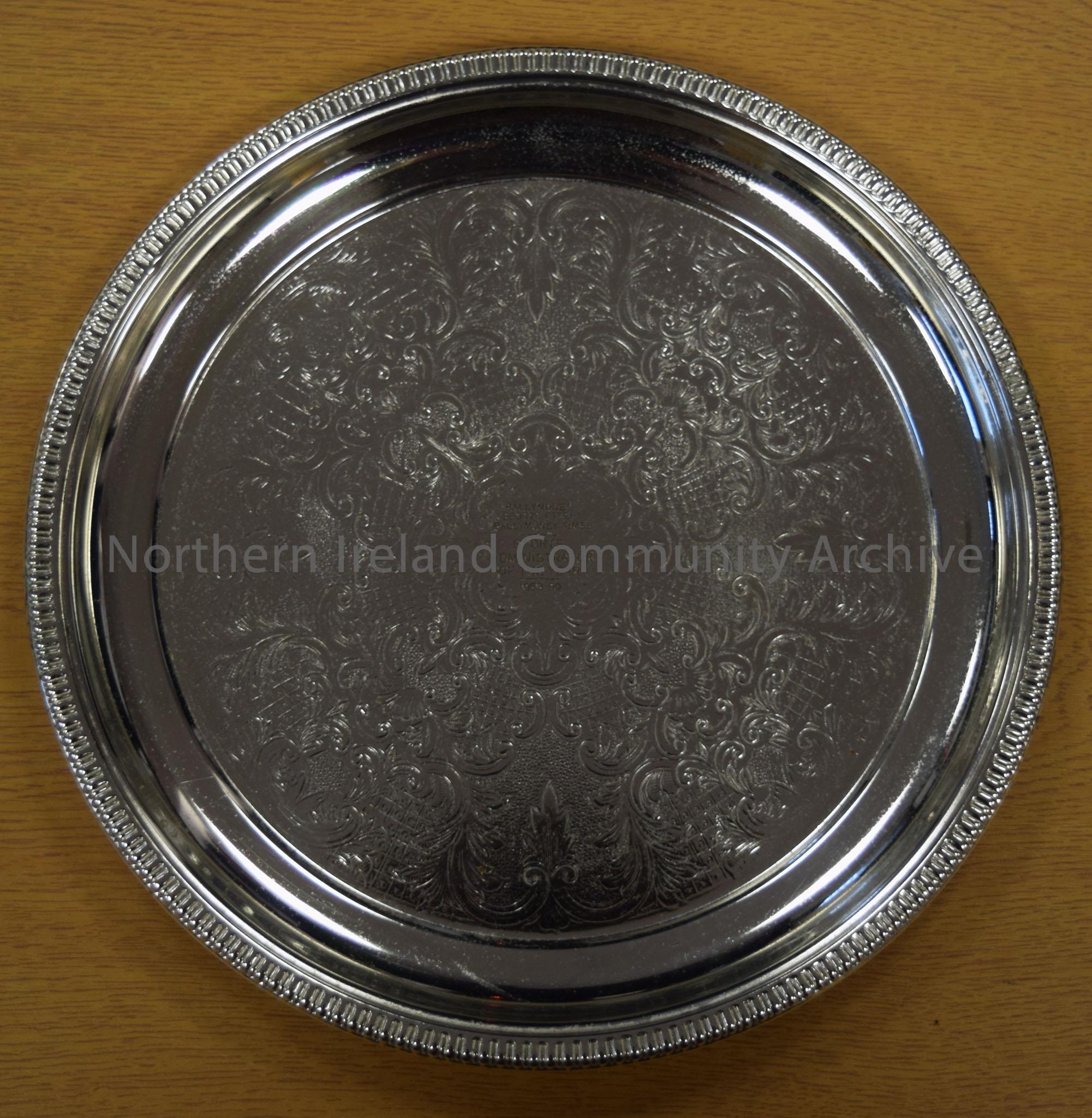 Silver tray. Ballymoney Sports Committee and Ballymoney Times Sports Administrator of the Year 1989-90