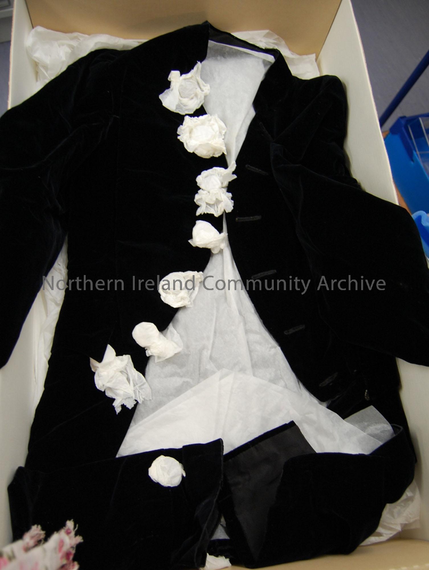 Sir William Baxter, court dress suit. Worn by Sir William when he was dubbed a knight. It was given to Mrs N. Patterson for her children to use for fancy dress.