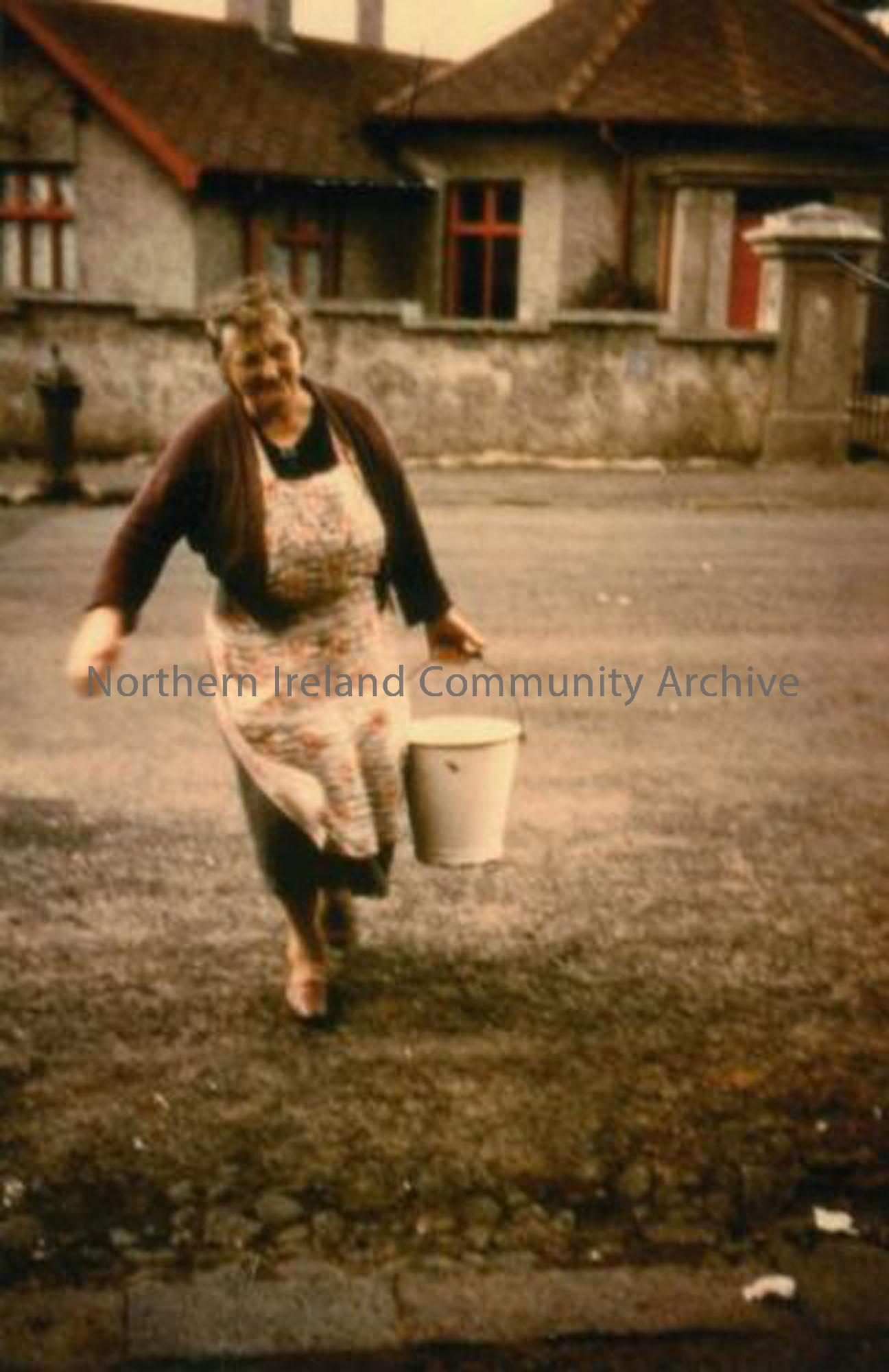 Sissie McCaughan collecting water in front of War Memorial Institute, Dervock