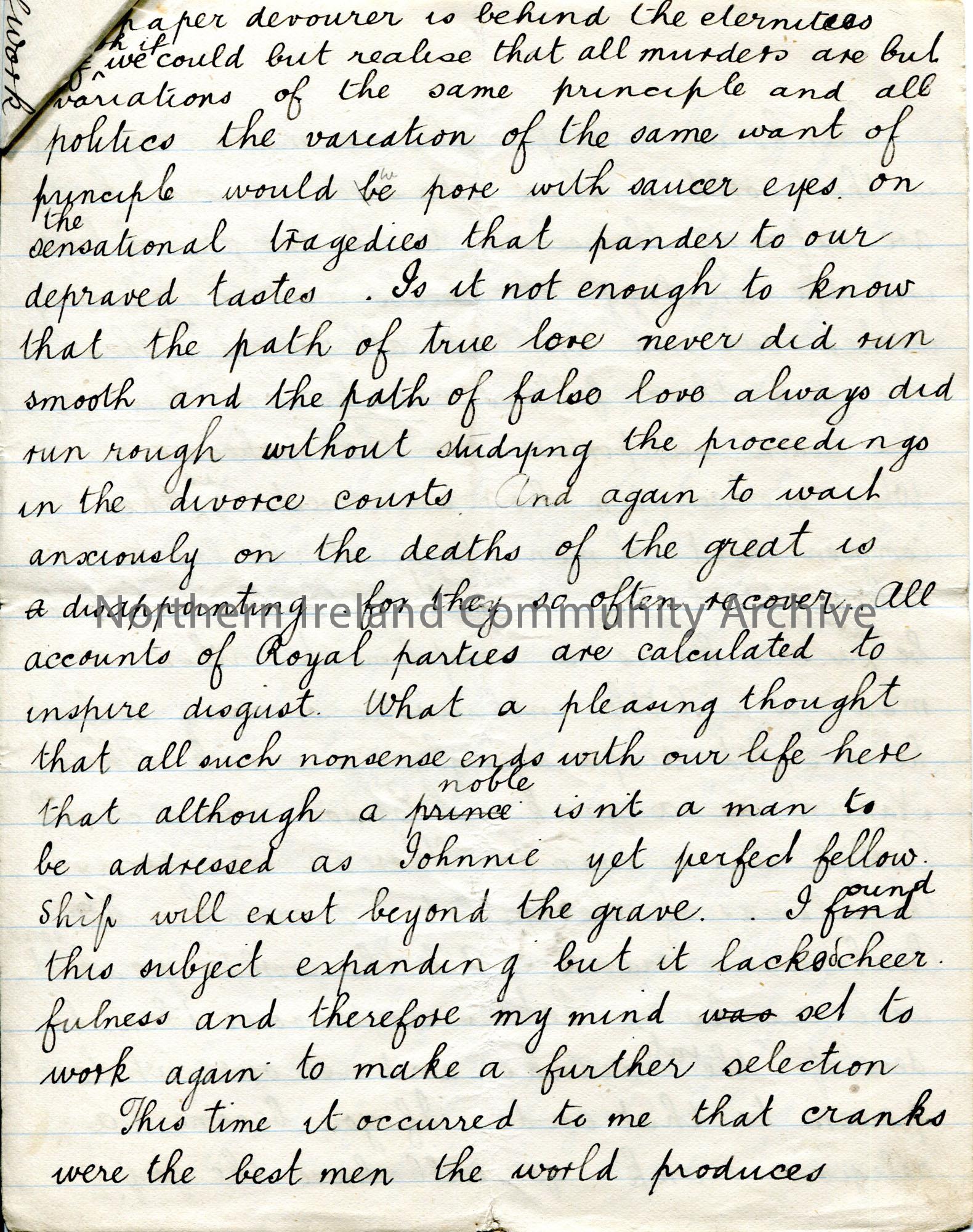 Six pages of a handwritten essay titled, ‘An Evening Walk’. Re philosophical, religious thoughts. Refers to the Sailor’s Society. Rough, handwritten n… – scan010g
