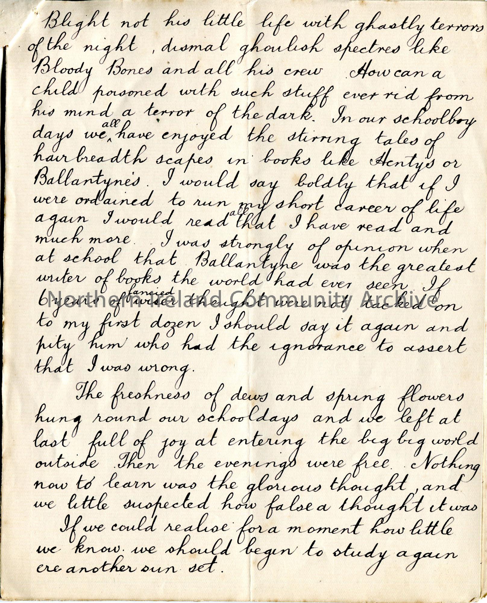 Six pages of a handwritten essay untitled. Appears to have been written for the New Row Association (Literary) which Sam was a member of. Re the importance of books and reading.
