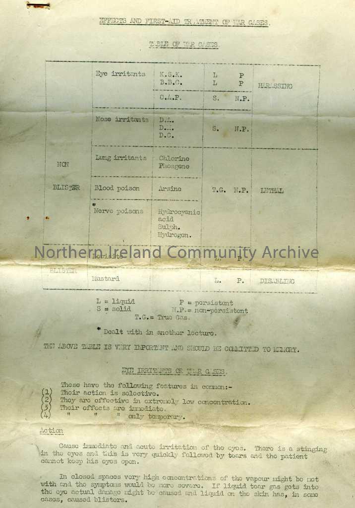 Six pages stapled together, titled “Effects and First Aid Treatment of War Gases”. Information regarding the signs and symptoms and the treatment of w…