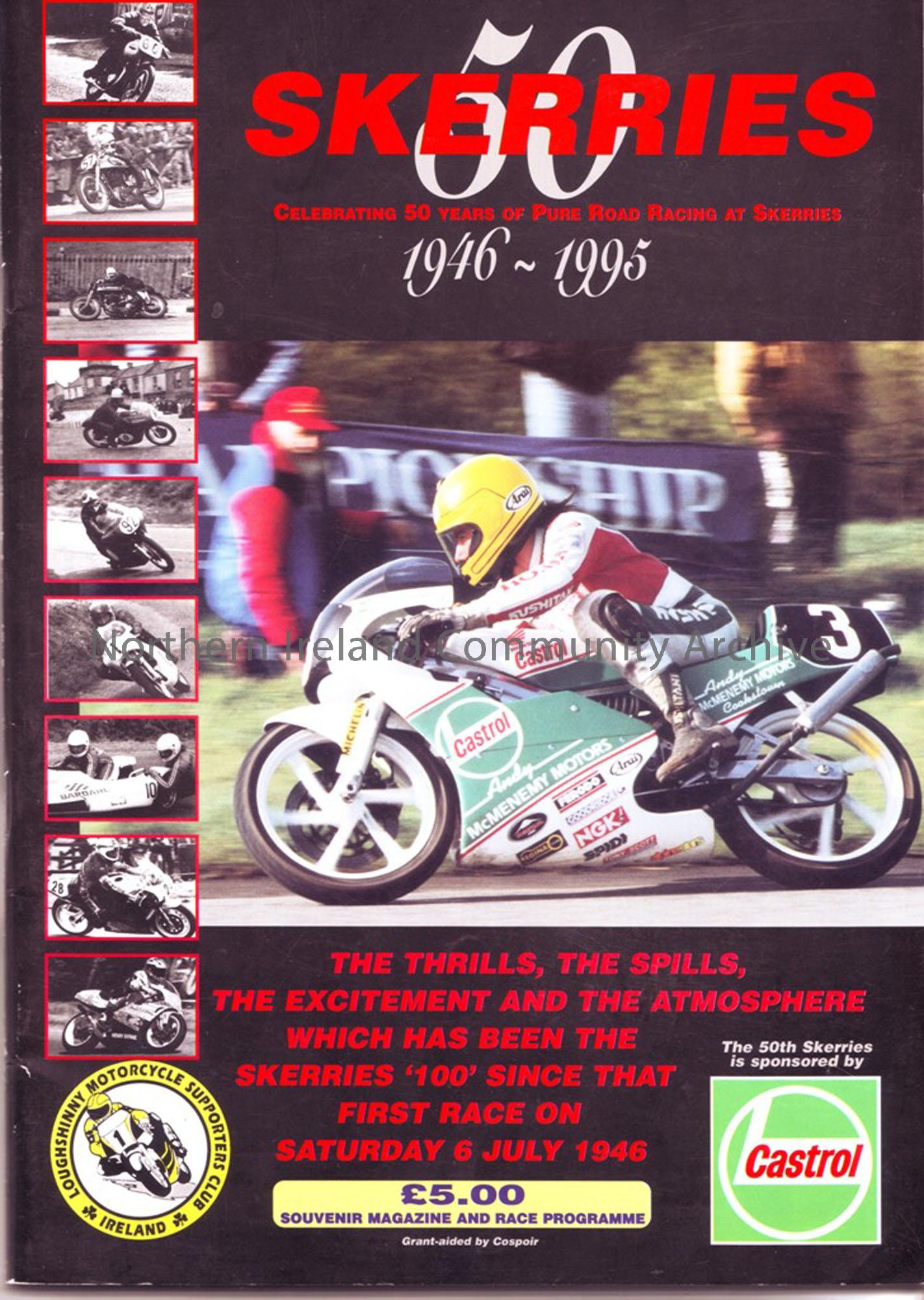 Skerries, celebrating 50 years of Pure Road racing at Skerries souvenir magazine and race programme. 1946-1995 Includes lists of Entrants in each class and lap score charts.