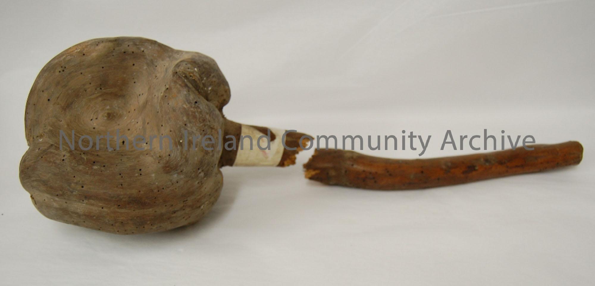Slender wooden handle leading to large circular head. Evidence of wood worm and the handle is broken.