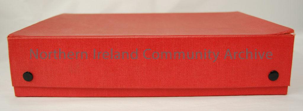 Slide case, red. Contains five slide containers, as BHC:2006.201. Upper interior contains numbered card sheet for naming slides – 2006.203 (1)