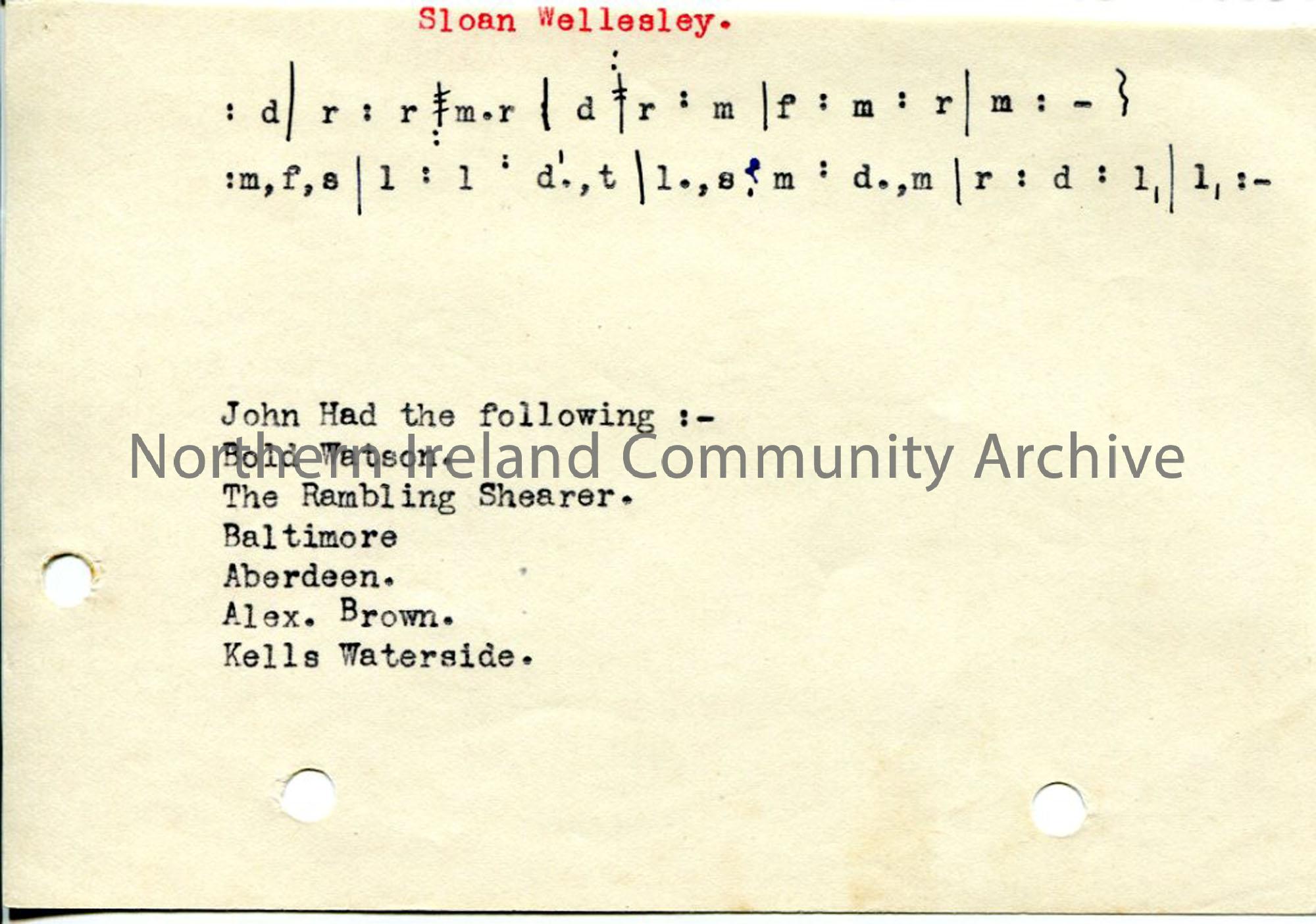 Typed tonic sol-fa notation to 'Sloan Wellesley', with short notes of other song titles.