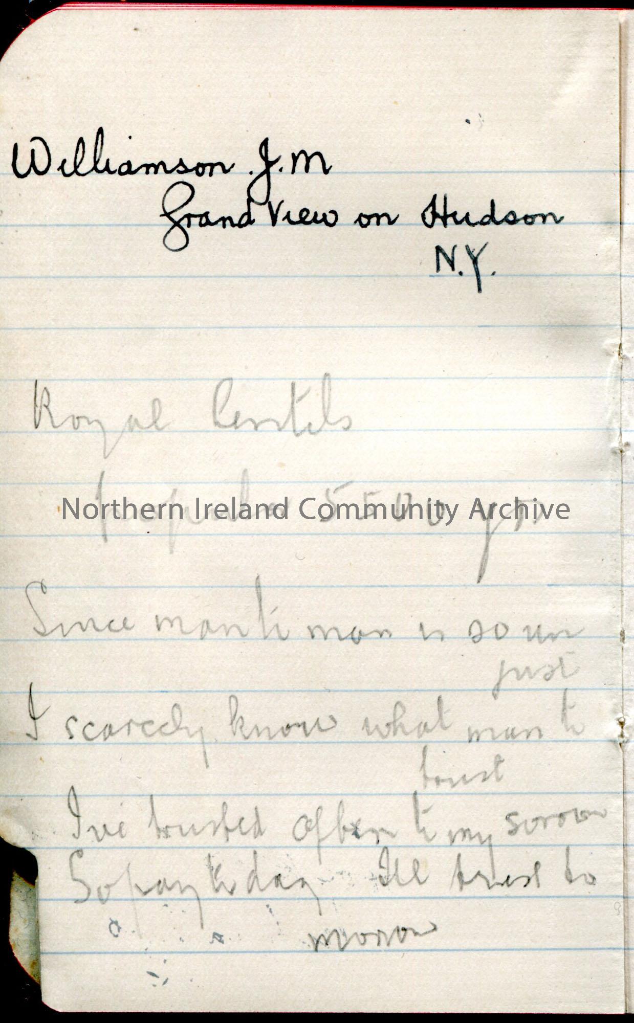 Small address book with brown/red cover. Majority of the addresses are based in North America. Handwritten notes in back of book re America. List of items, possibly for a trip (to America?) such as clothing and camera, Song book, diary, Bible. '£5 from Uncle John recd 20/5/11'.