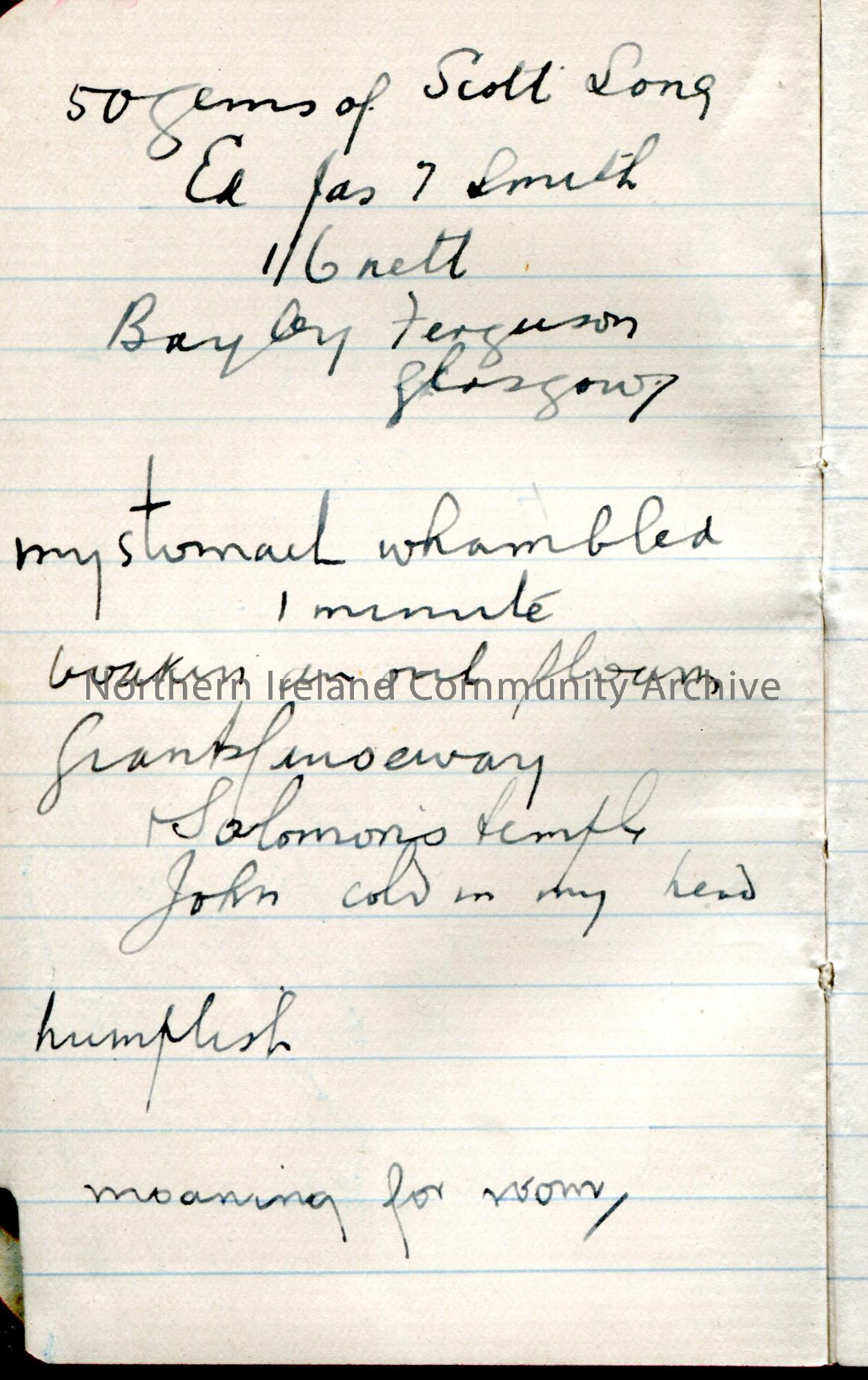 Small address book with brown/red cover. Majority of the addresses are based in North America. Handwritten notes in back of book re America. List of items, possibly for a trip (to America?) such as clothing and camera, Song book, diary, Bible. '£5 from Uncle John recd 20/5/11'.