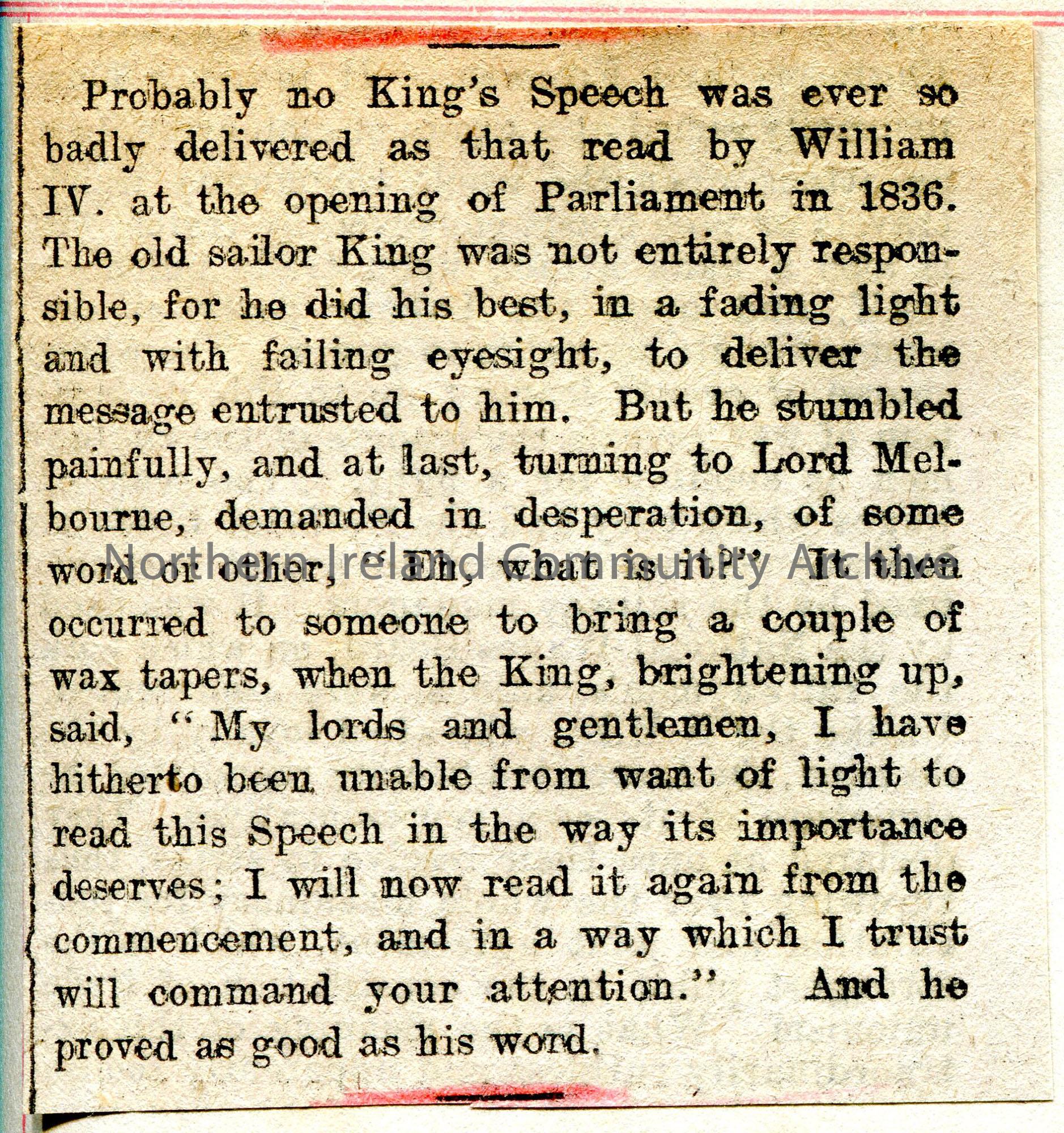 Small article cut from a newspaper re King William IV speech at opening of Parliament in 1836.