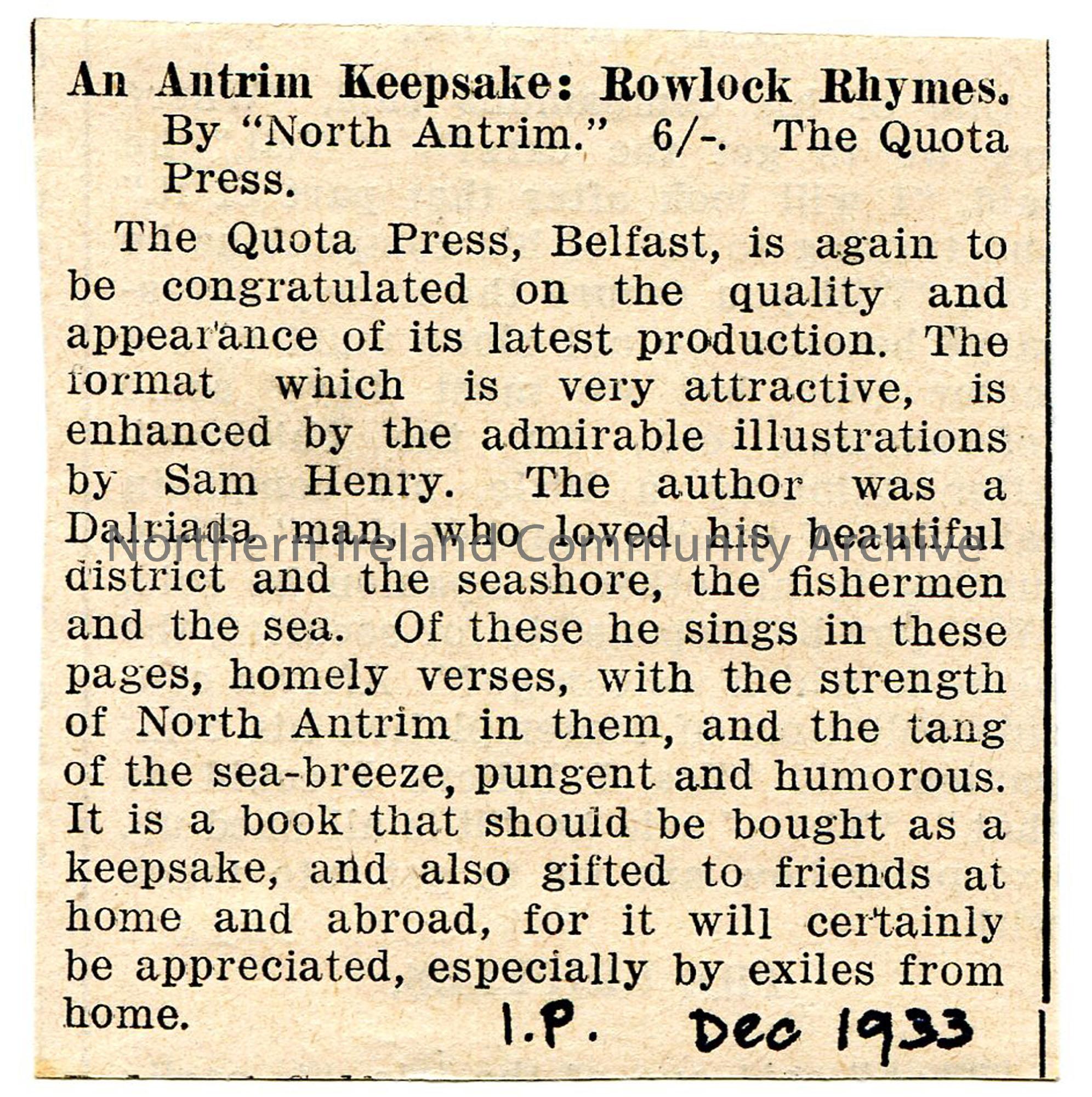 Small article cut from newspaper of a review of book 'An Antrim Keepsake: Rowlock Rhymes', edited by Sam Henry. 'I.P. [Irish Presbyterian?] Dec 1933' handwritten in ink at end of article.