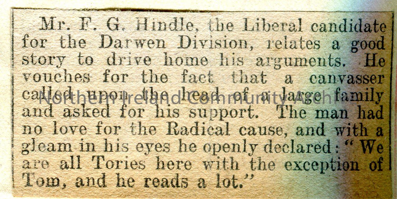 Small article cutting from a newspaper re Mr F G Hindle, Liberal candidate for Darwen Division.
