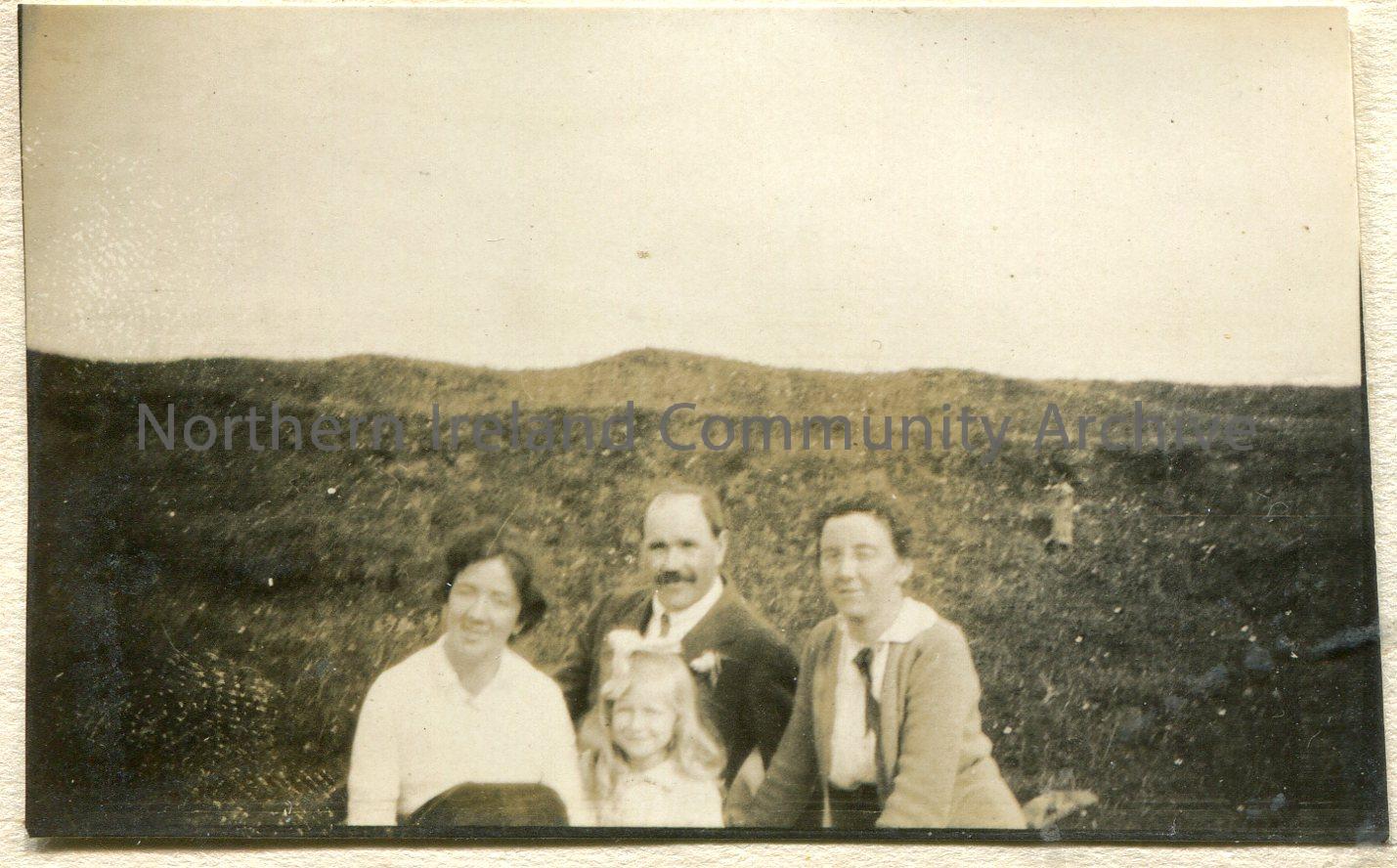 Small black and white photograph featuring Sam Henry (centre), Maimie Henry nee Liken (left). Another woman and girl are present in the image.