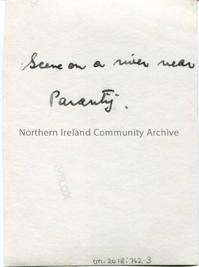 Small, black and white photograph of a river. Two people are walking in the foreground. Captioned ‘Scene on a river near Paranty [?]’. – scan170b