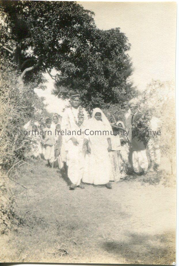 Small, black and white photograph of adults and children of Indian origin walking along a path with overhanging trees. 'A Christian wedding procession, the couple on their way to their own village - Gillisprepun [?]' handwritten on reverse.