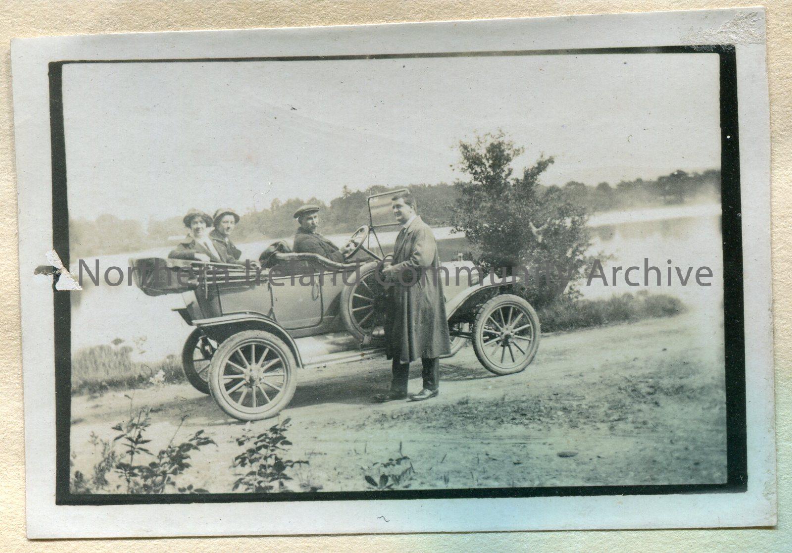 Small, black and white photograph of four people - three are sat in a car and the other is standing beside it. Far left is Maimie Henry, Sam's wife. Far right is possibly John Simpson [of Simpson & Hill according to JM see CM:2015.929.546].