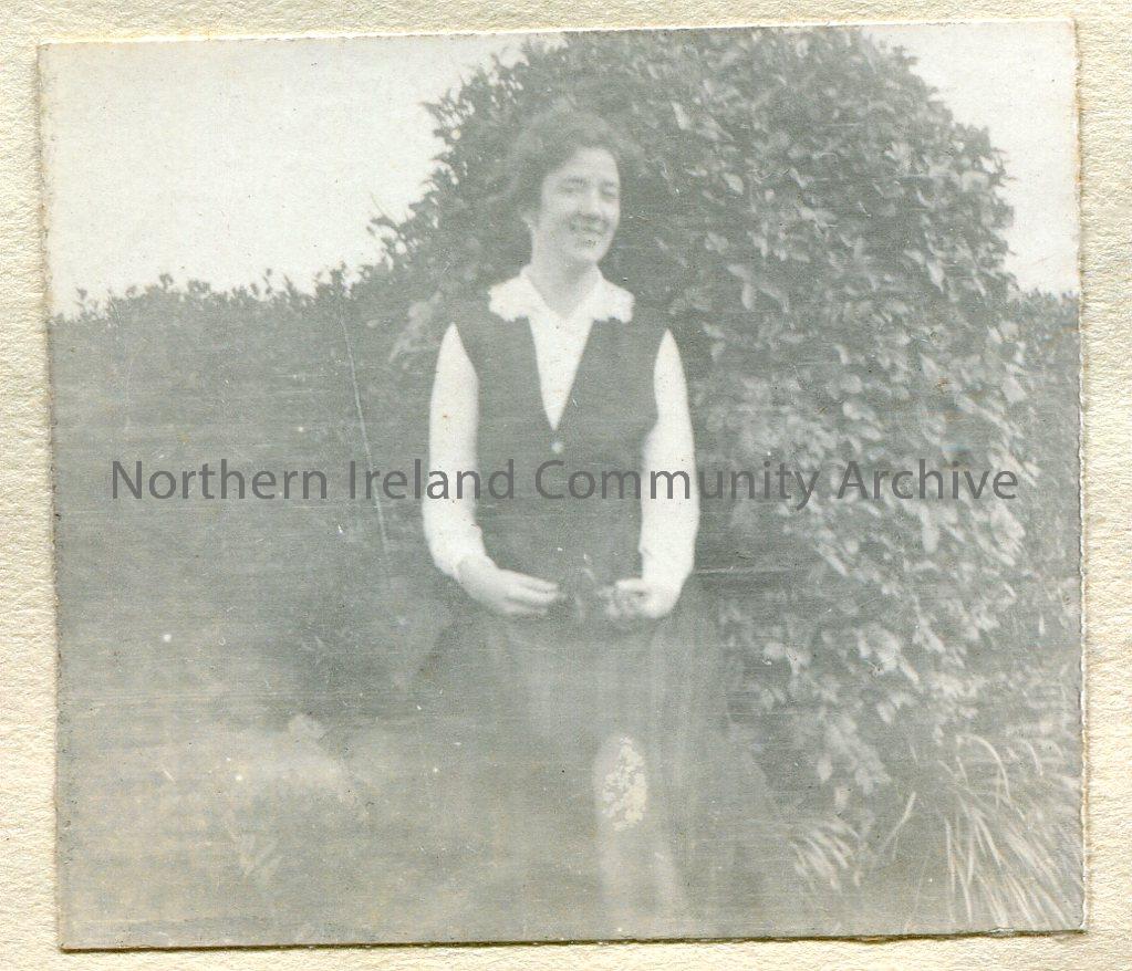 Small black and white photograph of Maimie Henry, Sam’s wife. She is holding something in her hands but it is unclear in the photograph.