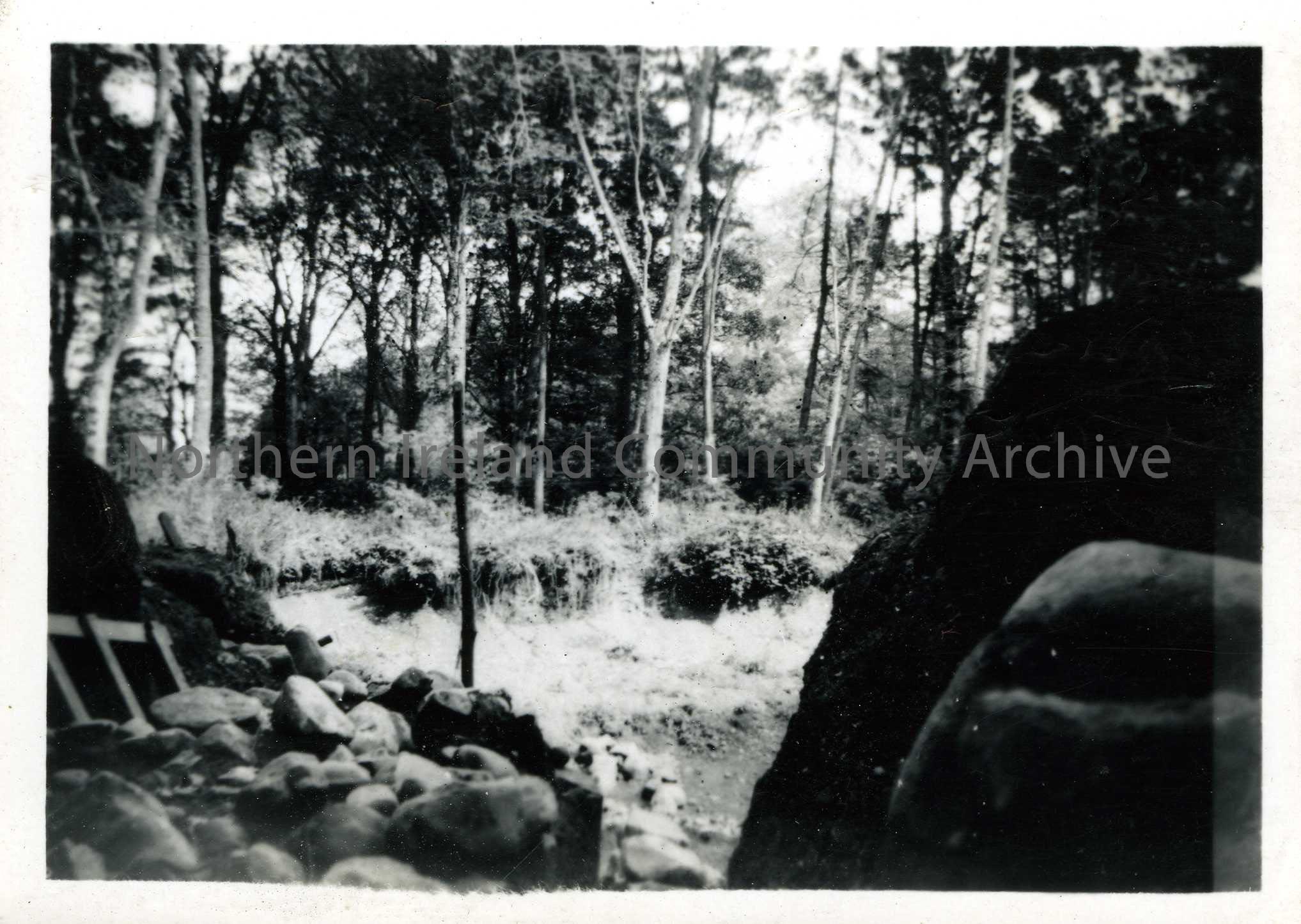 Small black and white photograph of Somerset, Coleraine. Shows trees with foliage in front and rocks and stones in the foreground. Written on the back of the photograph is - 'Somerset, Coleraine. Ancient habitation site in Drumlin, lowest site about last Ice Age, other sites superimposed of stone Bronze + iron age.