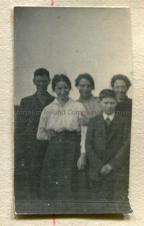 Small, black and white photograph of three women, one man and one boy standing together.